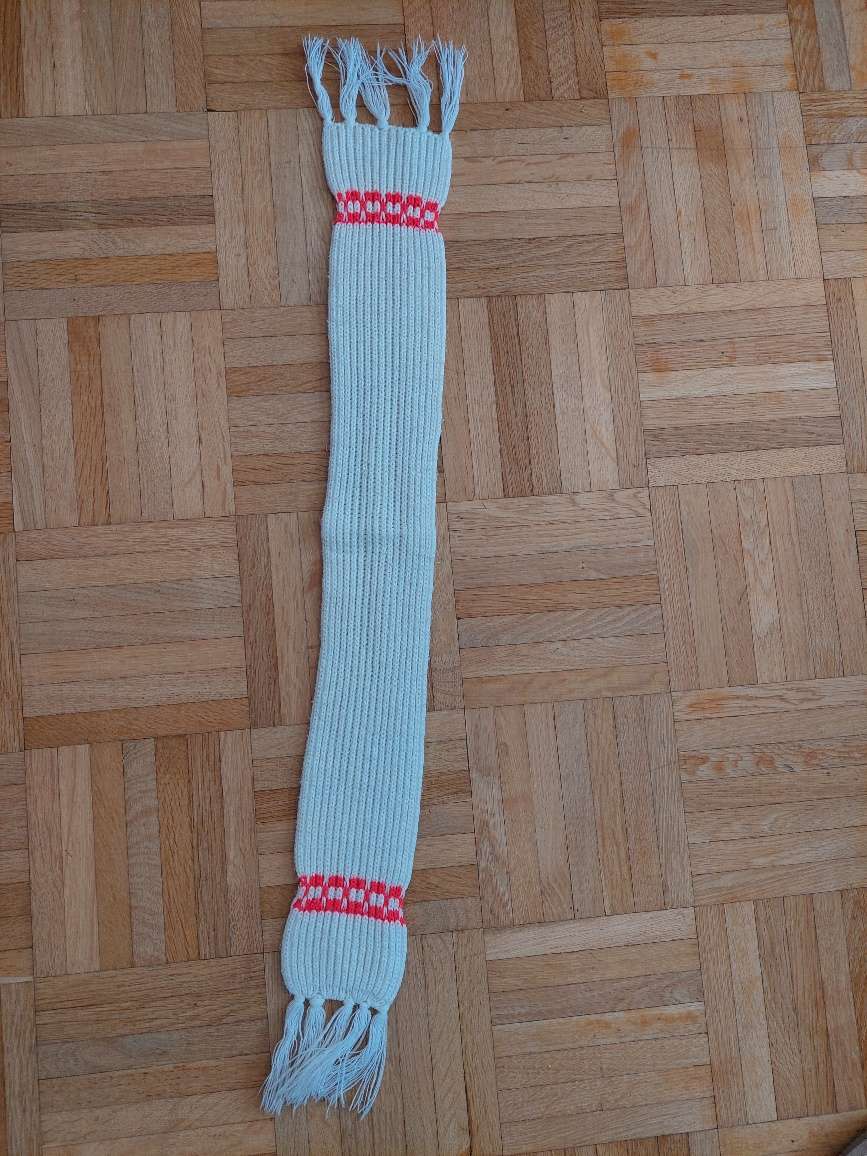 Kinderschal weiß-rot; 74 cm lang ohne Fransen; Privatverkauf, daher keine Garantie und keine Rücknahme. Selbstabholung! Tierfreier Nichtraucherhaushalt. Bei Interesse bitte e-mail.