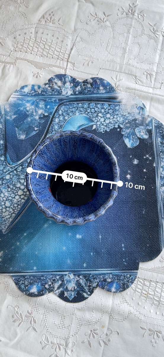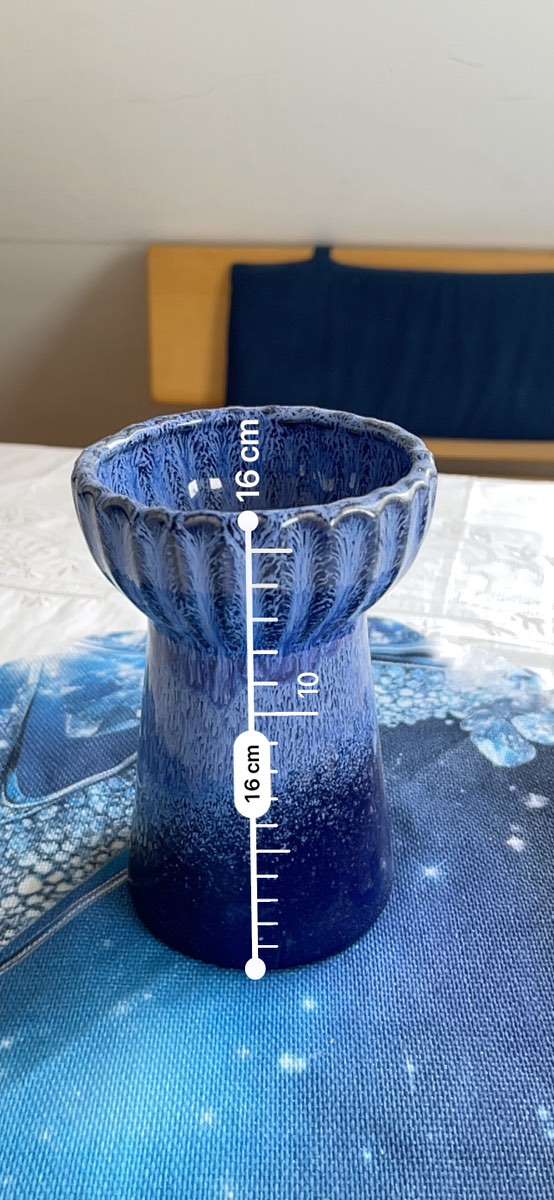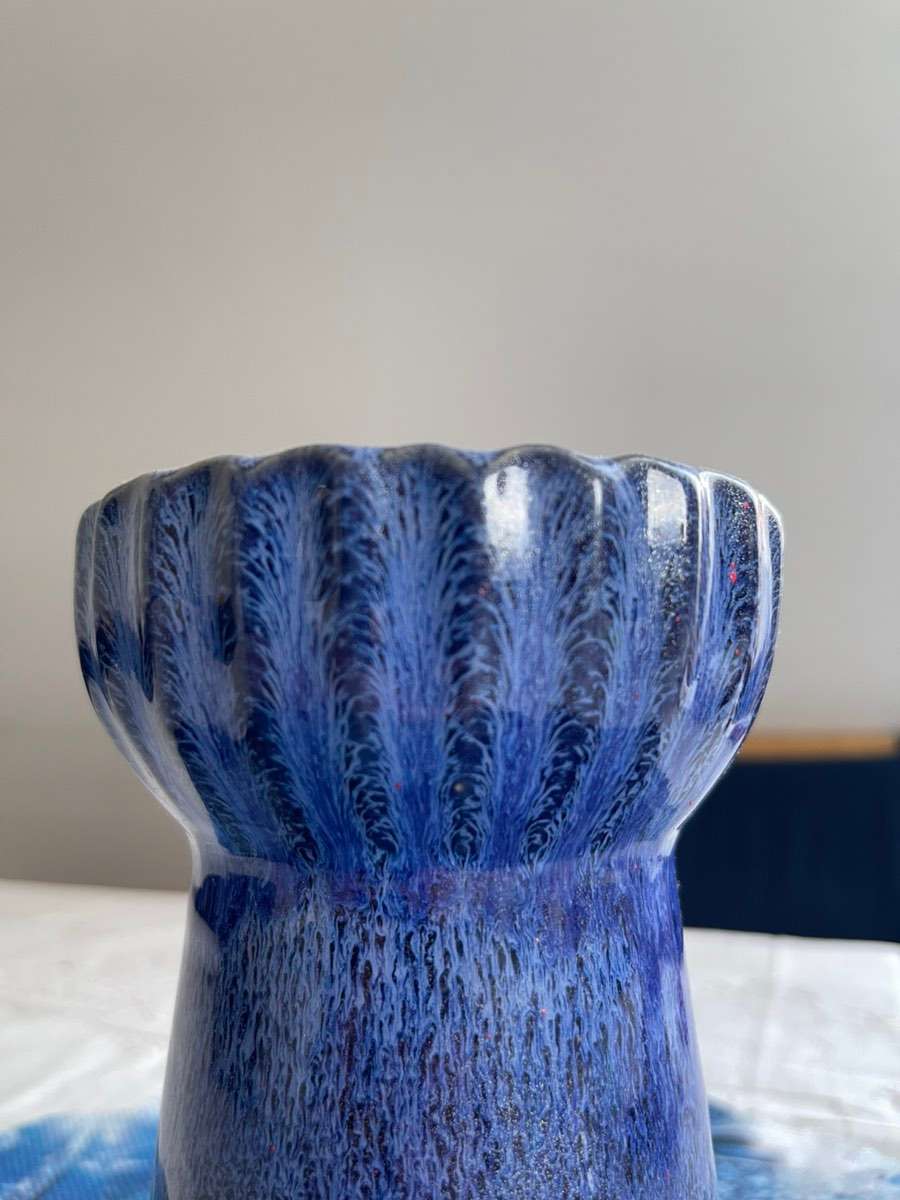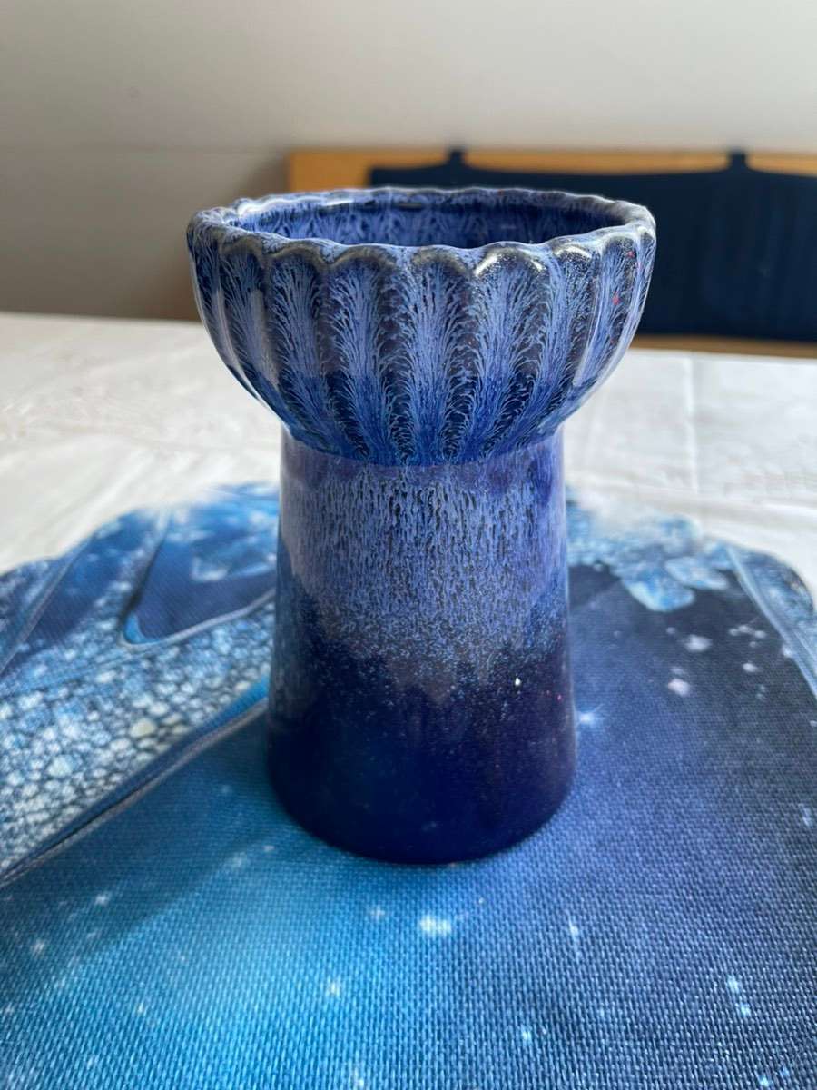 Blumenvase aus blauer Keramik im Ombre-Look. (Verlauf) Flecken auf der Innenseite, ansonsten noch sehr schön! Abholung oder Versand.