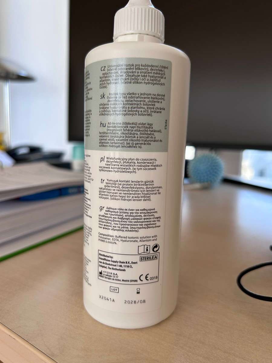 Kombilösung für Kontaktlinsen zur täglichen Reinigung. Halbe Flasche, ich benutze sie nicht mehr, da ich jetzt Tageslinsen verwende.