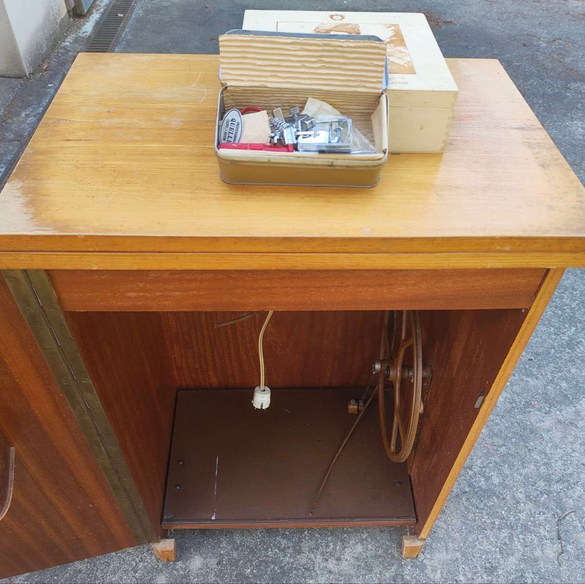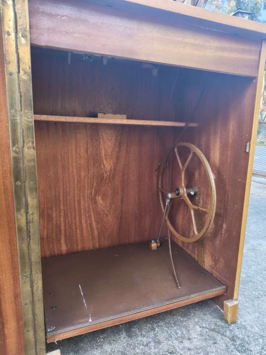 Nähmaschine mit Pedalantrieb in Schränkchen