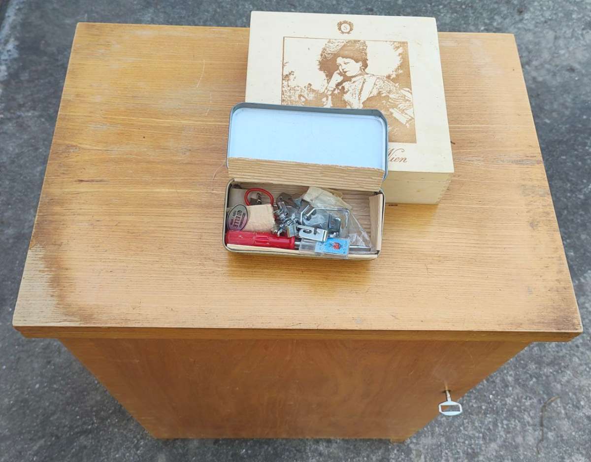 Mit Zubehör, der Antriebsriemen aus Leder ist zermürbt, sonst funktionierend. Diverses Nähzubehör auch dabei.