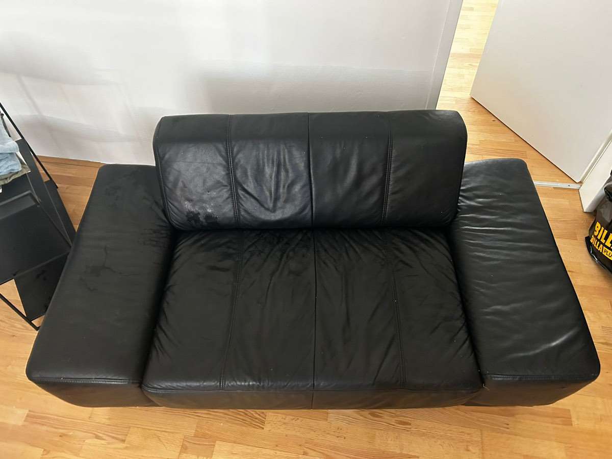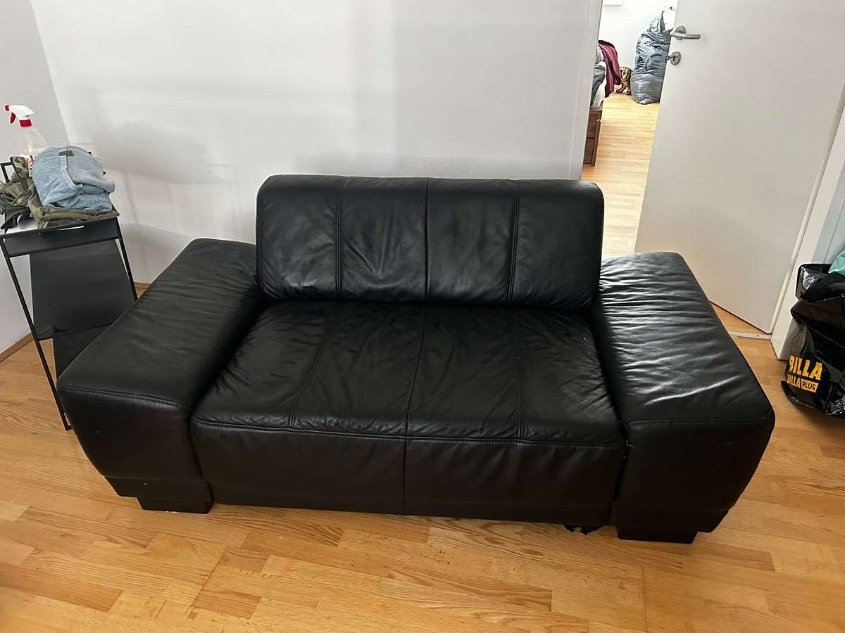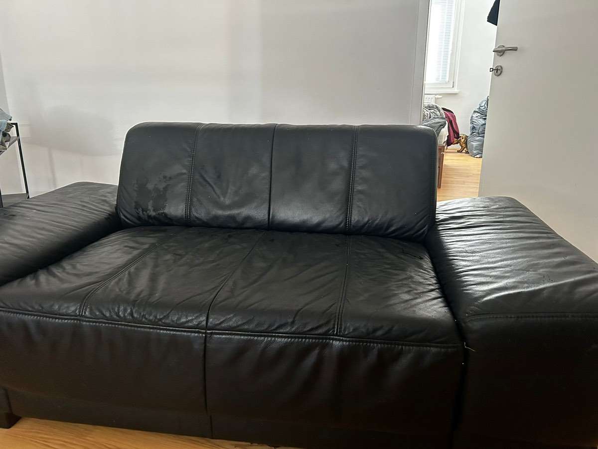Ein Kunstledersofa ca 165cm lang Äußerlich guter Zustand dafür das es fast 7 Jahre bei uns war Einziges Manko , der Stoff auf dem Sofa Boden wurde von unseren Katzen aufgerissen Auf den Bildern ersichtlich
