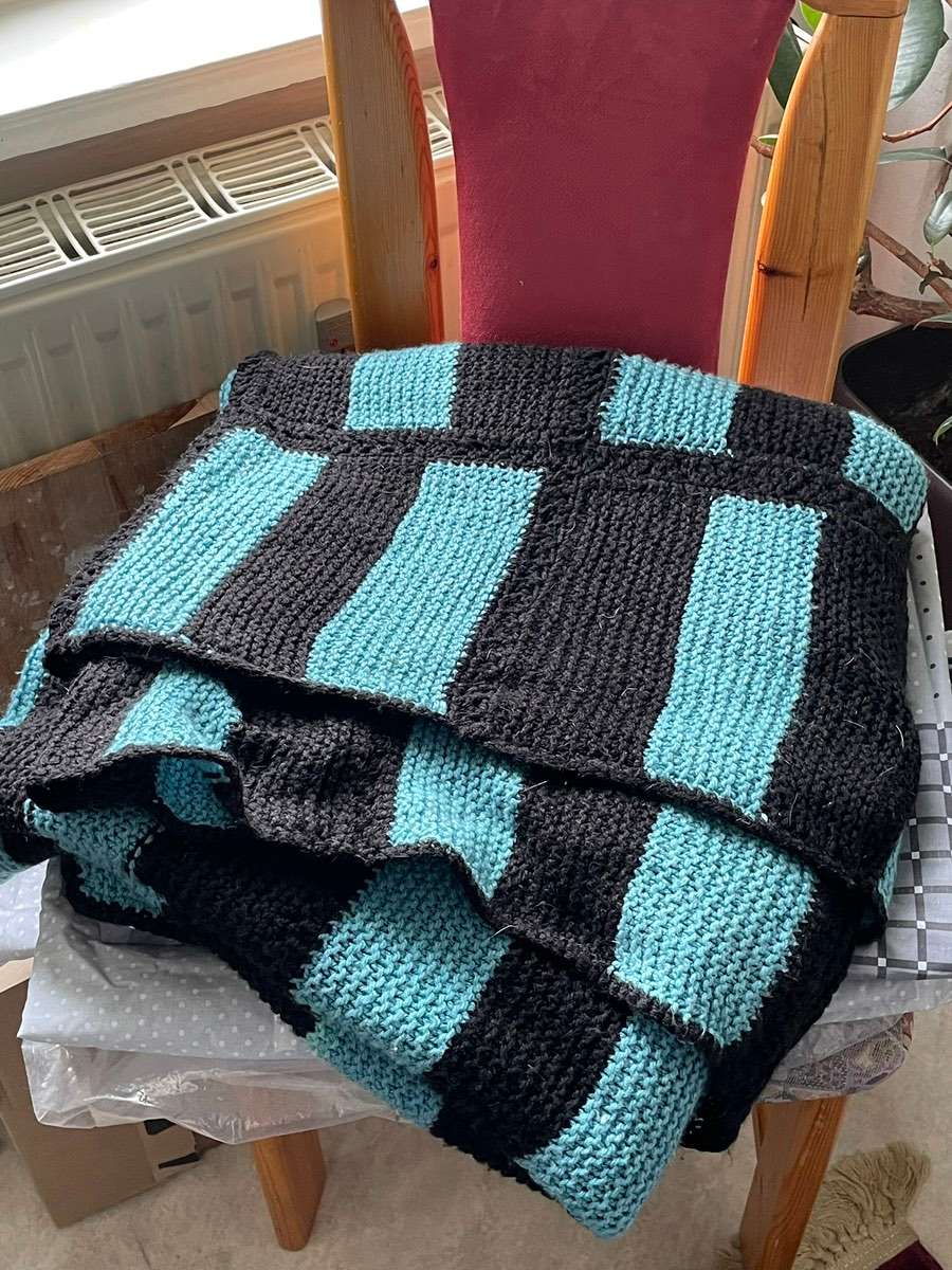 Gestrickte Decke. War in einer Wohnung mit Katze. Nichtraucherhaushalt