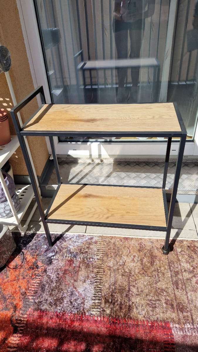 Beistelltischerl mit Rollen auf einer Seite und Tragegriff zu verschenken. Holz etwas ausgebleicht, da am Balkon für Blumen verwendet. Voll funktionsfähig.
