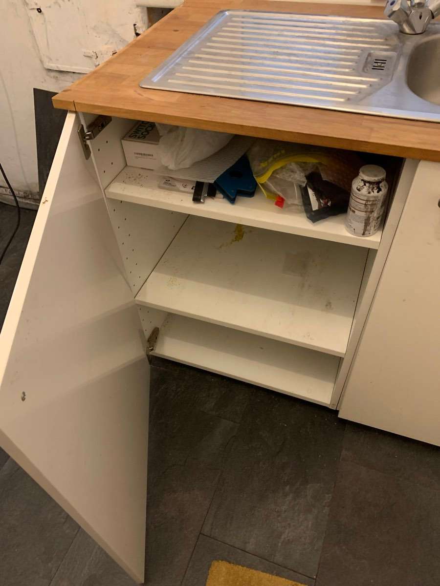 Spüle, Abwasch, Waschbecken mit Kasten, Armatur, Siphon, abtrofblech, Fächer