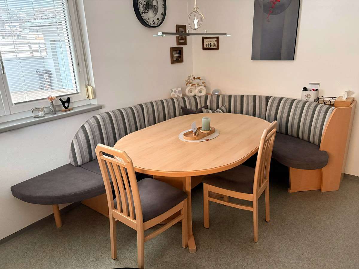 Eckbank mit Ovaltisch zu verschenken. Polsterung wurde vor zwei Jahren neu gemacht Maße Bank: 205 cm (rechts) × 260 cm (links) / Tisch oval 160 cm x 110 cm / 2 Stühle Bank wurde bereits abmontiert. Baldigste Abholung gewünscht