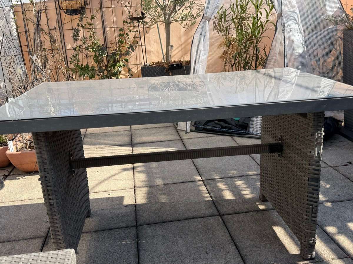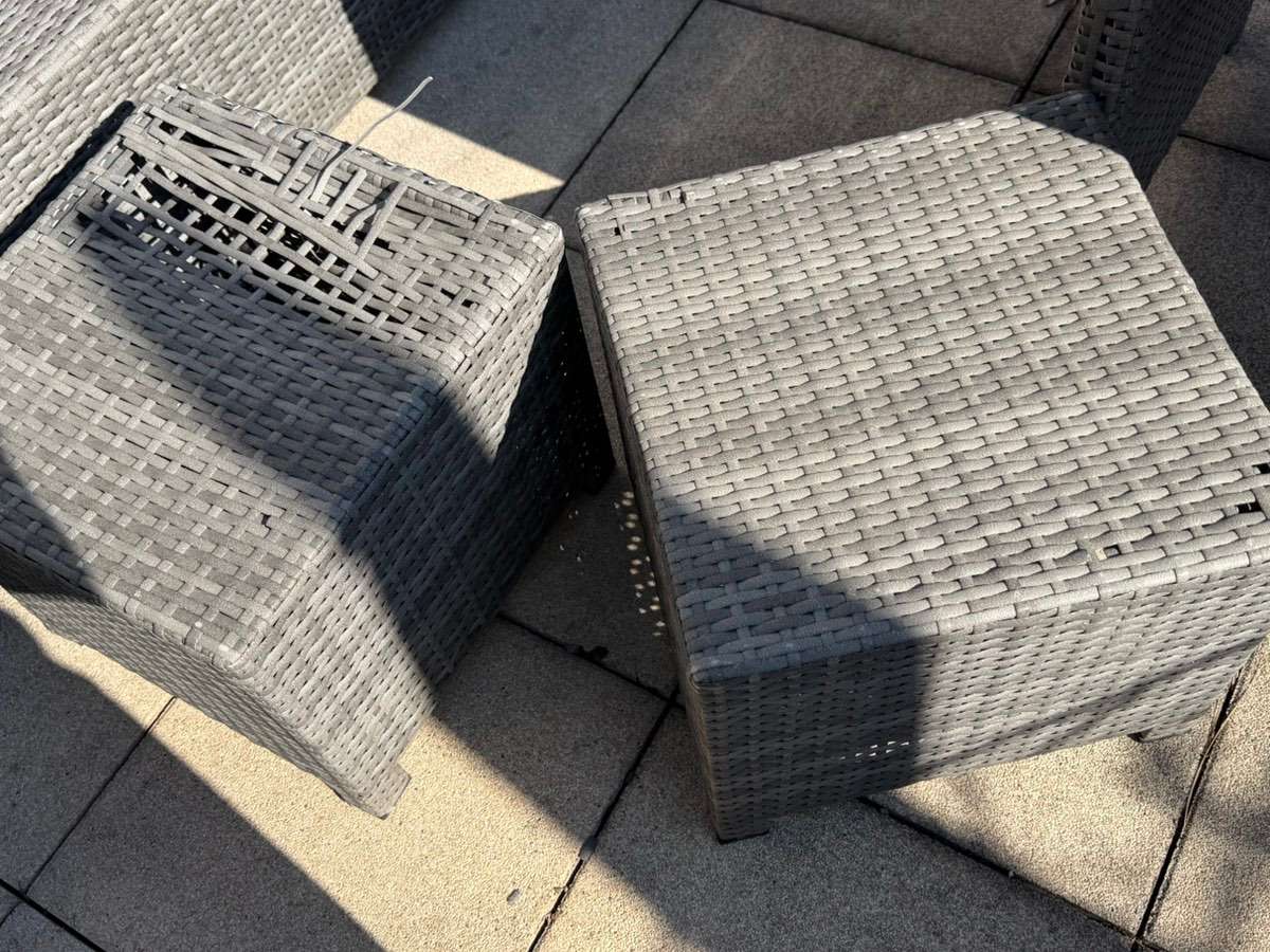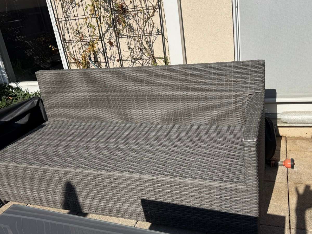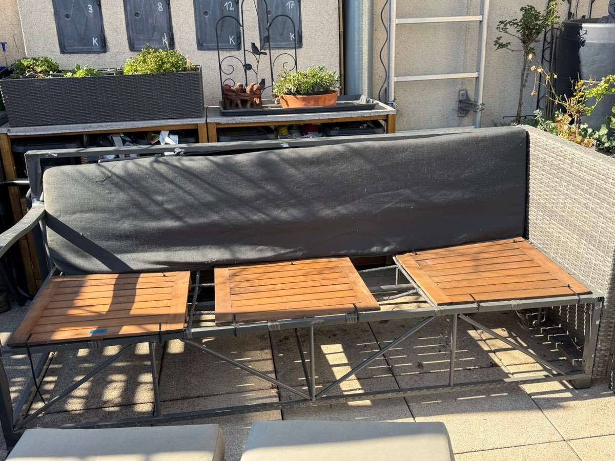 Sitzgruppe 1 Bank 190 x 70 Höhe 74, Sitzhöhe 34 1 Bank 170 x 70 Höhe 74, Sitzhöhe ohne Polster 34 Tisch 120 x 70, Höhe 66, 2 Hocker 40 x 40 Maße in cm und ca.Angaben (bin nicht sehr gut beim Messen) Eine Bank leider schon sehr kaputt, hat sich das Rattan...