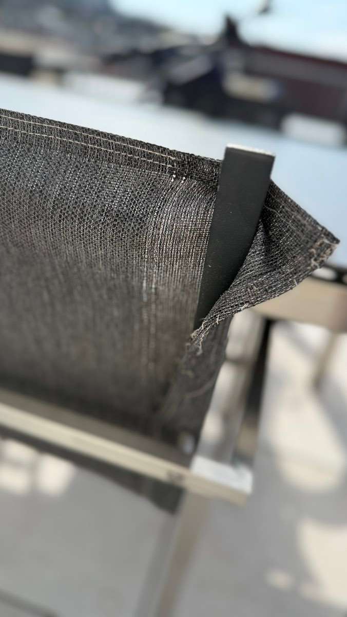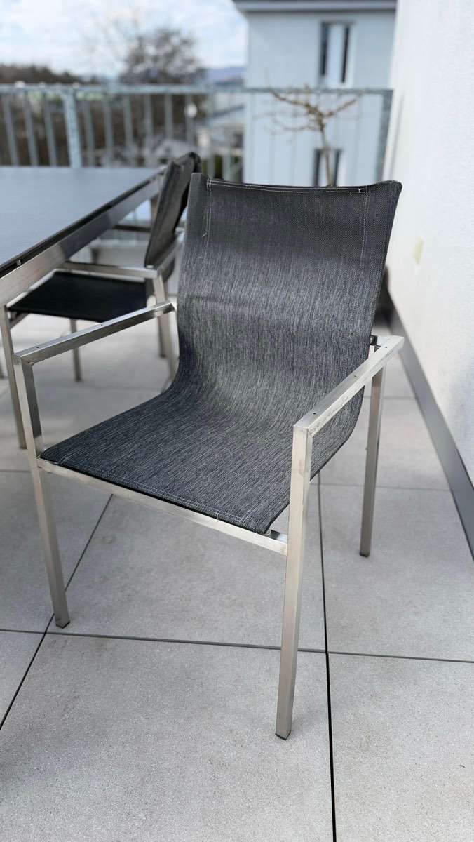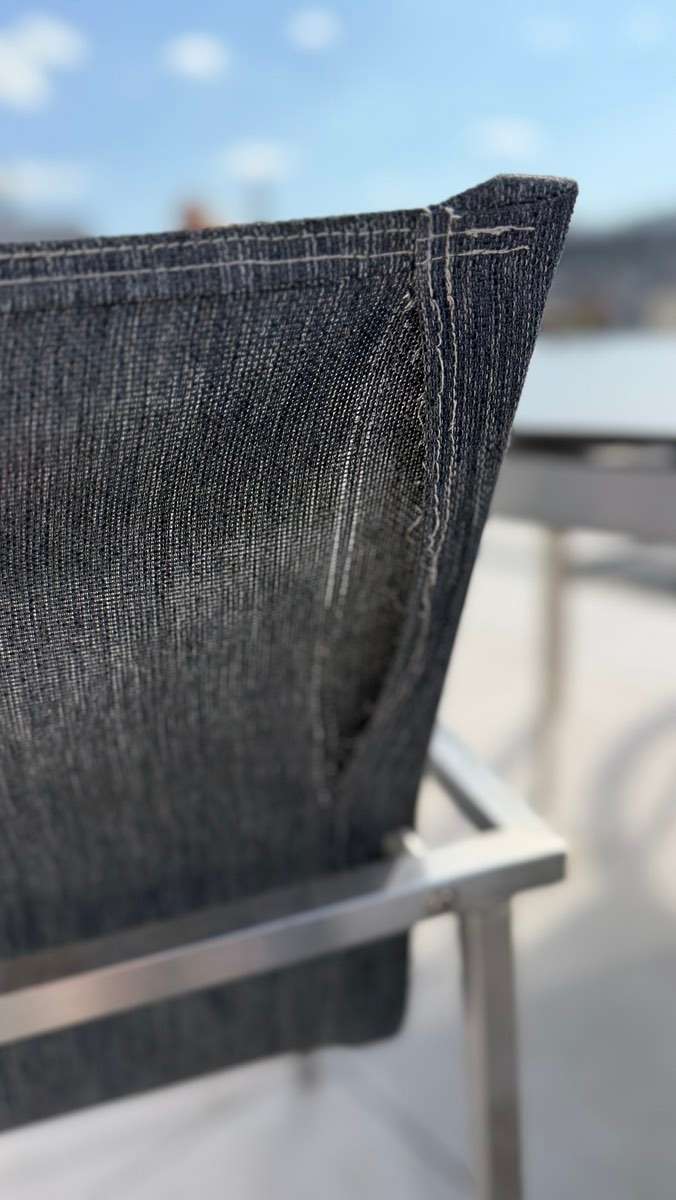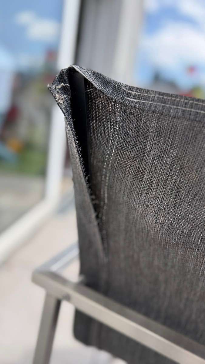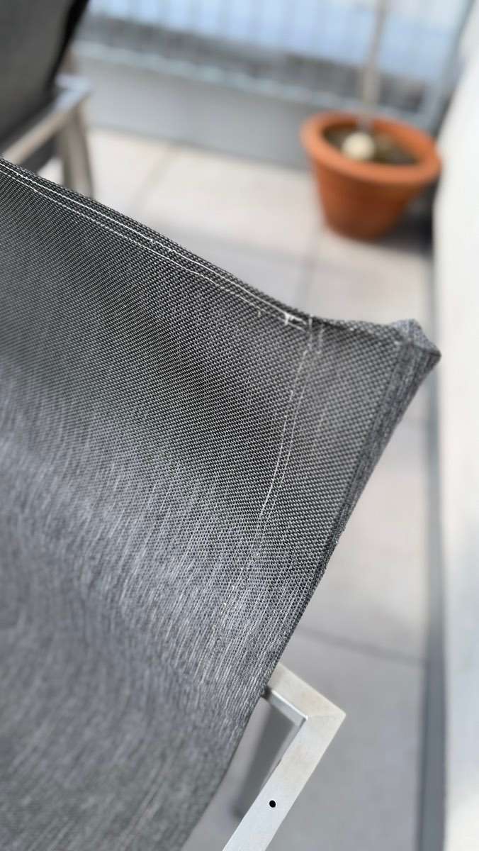 4 Garten Stühle wo leider bei 2 Stühlem die Naht am Rücken komplett gebrochen ist und bei einem weiteren Stuhl die macht schon ein bisschen bricht! - siehe Fotos Die Stühle selbst sind einwandfrei