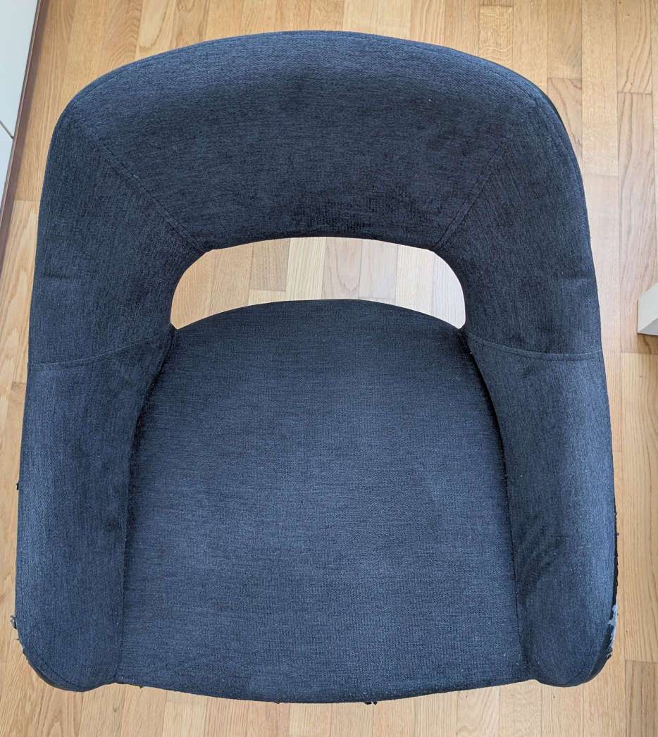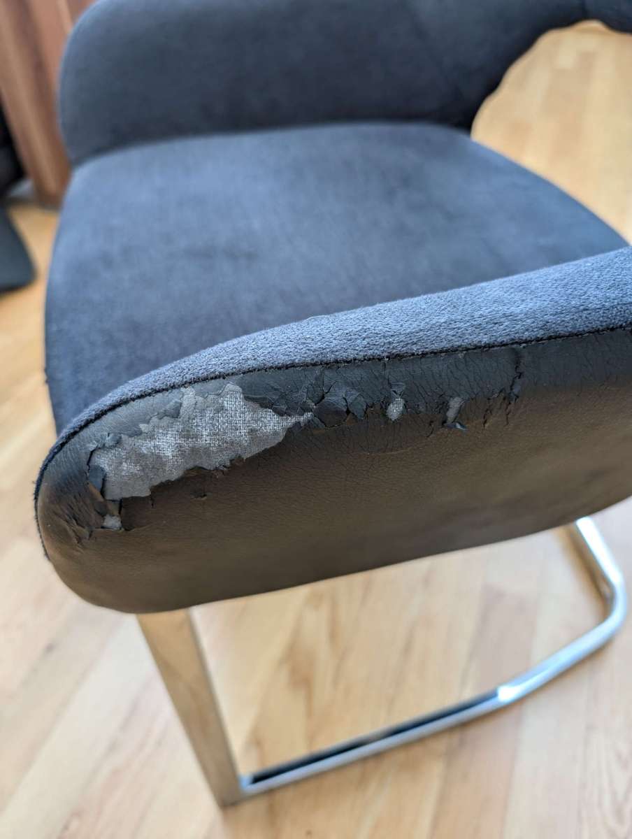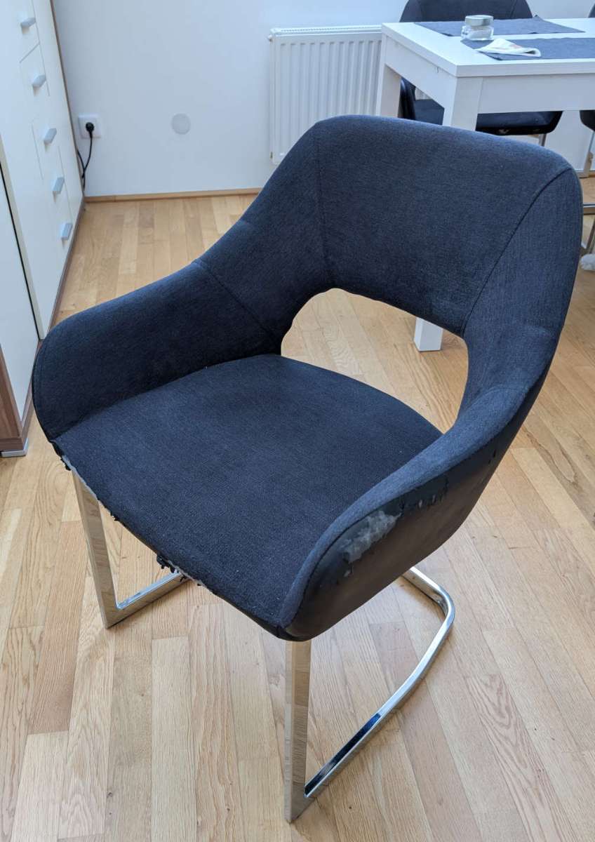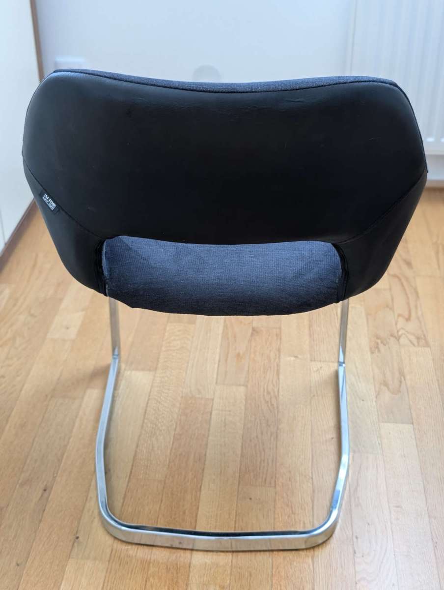 Verschenke 4 Schwingstühle „Time Your Style" Die Stühle haben einen dunkelgrauen Webstoffsitz, eine Rückenlehne im schwarzen Lederlook und ein verchromtes Metallgestell. Maße (B × H × T): ca. 60 × 60 × 80 cm Zustand: Das Kunstleder bröckelt, wie auf den...