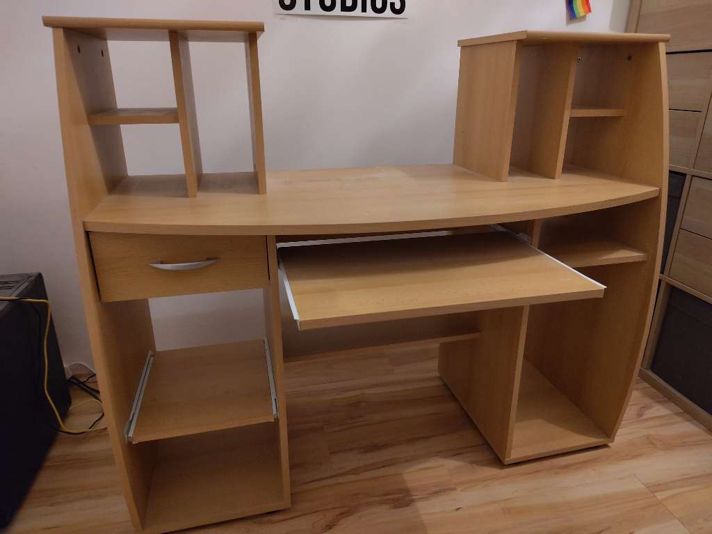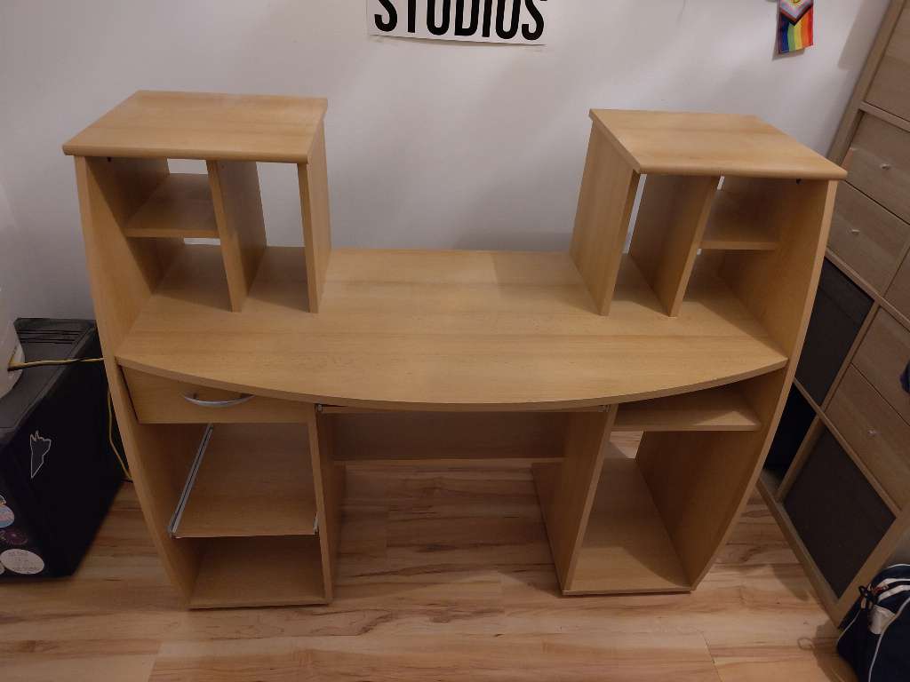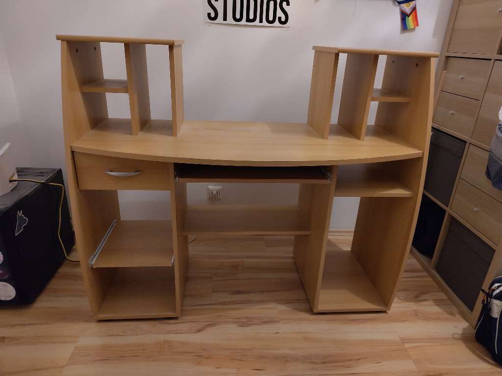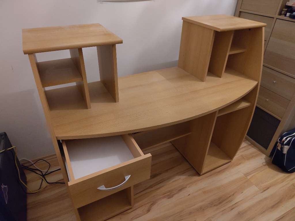 In guter Kondition. 127cm breit, 110cm hoch, 57cm tief an breitester Stelle der Tischplatte, 45cm tief an innerer Kante. "Beinplatz" Breite 57cm 1 Lade und 2 ausziehbare Fächer. Zerlegbar. Nur Selbstabholung, ich helfe gerne beim Stiegen hinunter tragen...