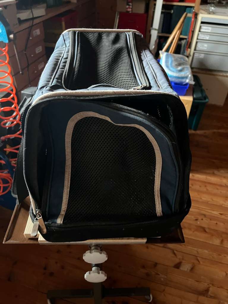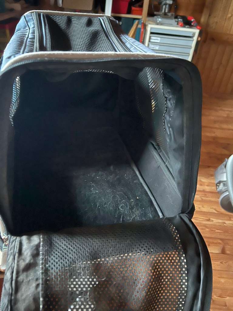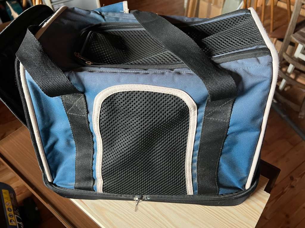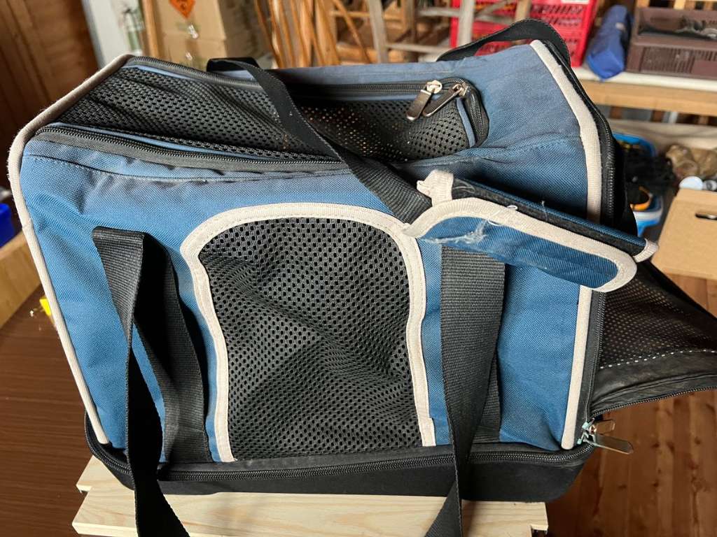 Transporttasche für Hunde. Mit festen stabilen Boden. Reißverschluss defekt. Könnte man reparieren lassen, oder zunähen da von oben auch die Öffnung möglich ist. Ideal für den Transport im Flugzeug Nur Abholung