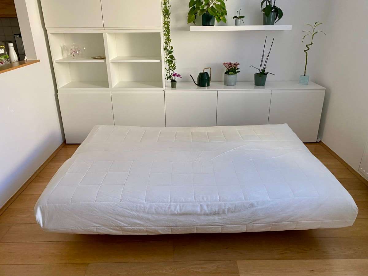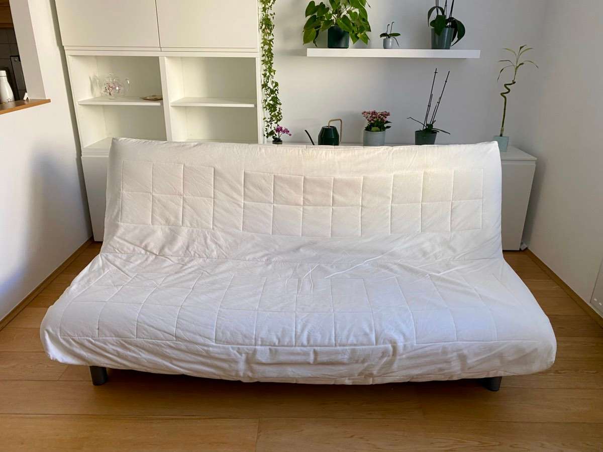Schlafsofa Abnehmbare Husse 195 cm breit/ 90 cm hoch/ Sitzfläche 80 cm Als Bett 195x 125 Gerne mit Polster und Decke Der Verkauf erfolgt unter Ausschluss jeglicher Gewährleistung.