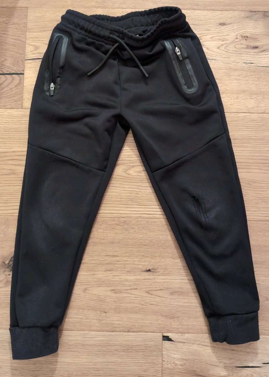 Schwarze Dunnes Jogging Hose. Am Knie beschädigt. 5-6 Jahre (ca. Grösse 110)
