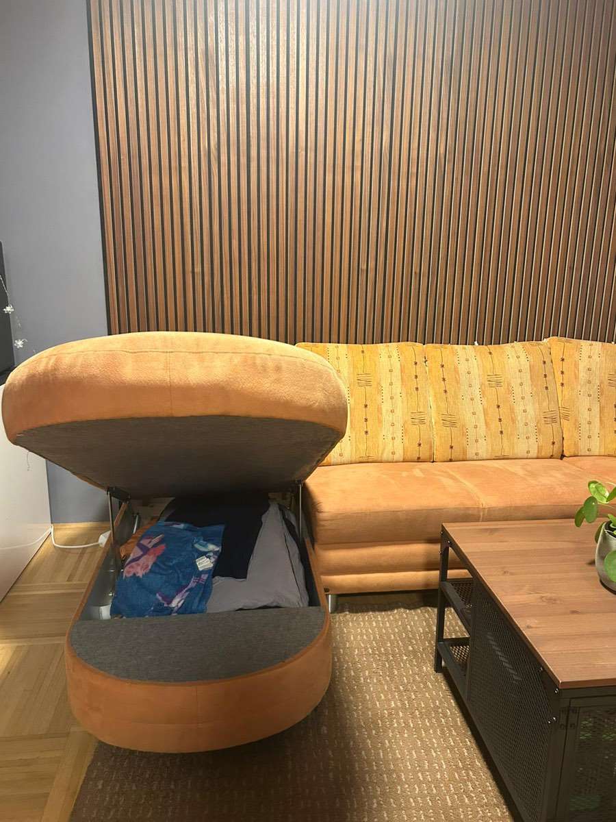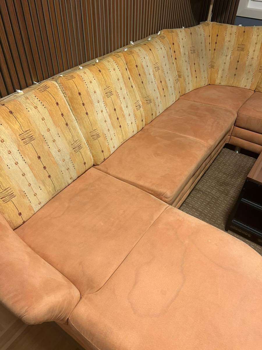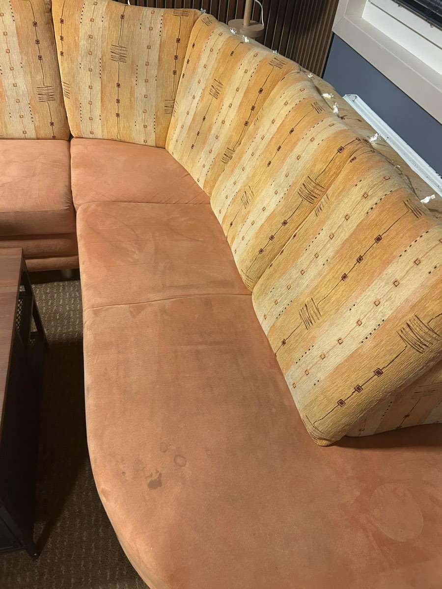Maße Couch: Breite ca. 285cm Länge Rechtes Teil ca. 225cm Länge Linkes Teil ca. 155cm Höhe ca. 42cm Maße Hocker: ca. 57x57x42cm Der Bezug weist einige Flecken auf (siehe Fotos), beeinträchtigt aber weder Komfort noch Funktion – mit einer professionellen...