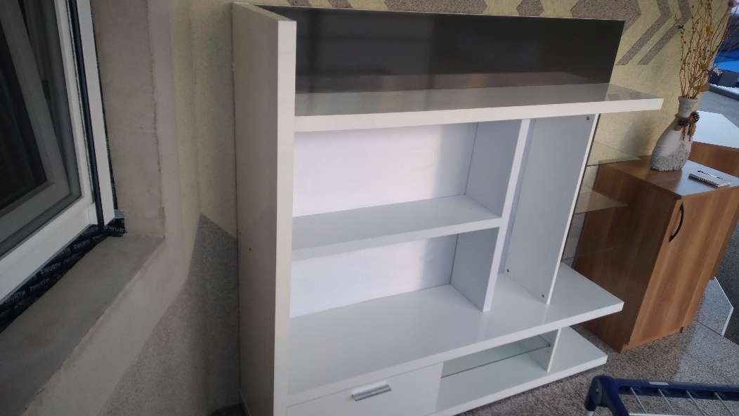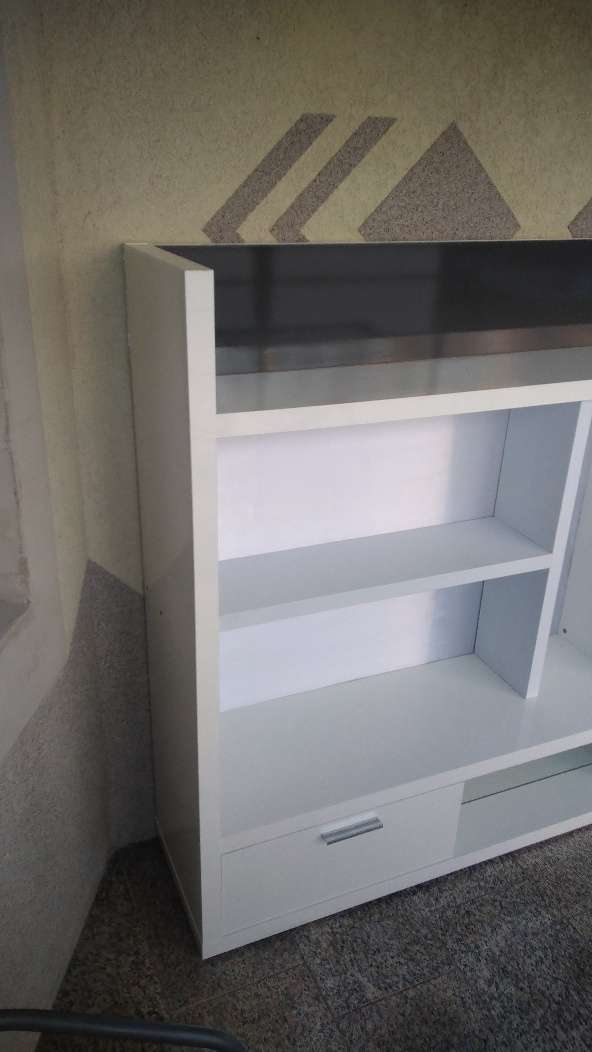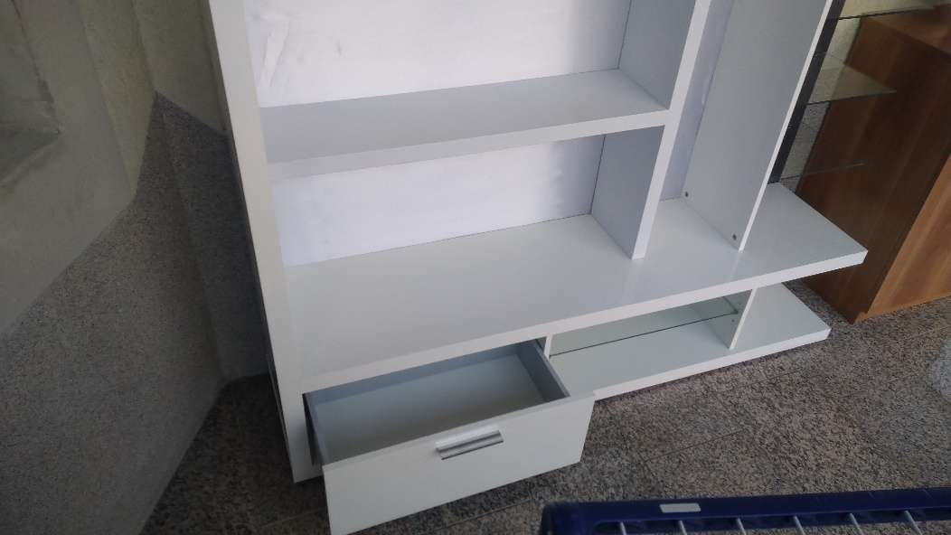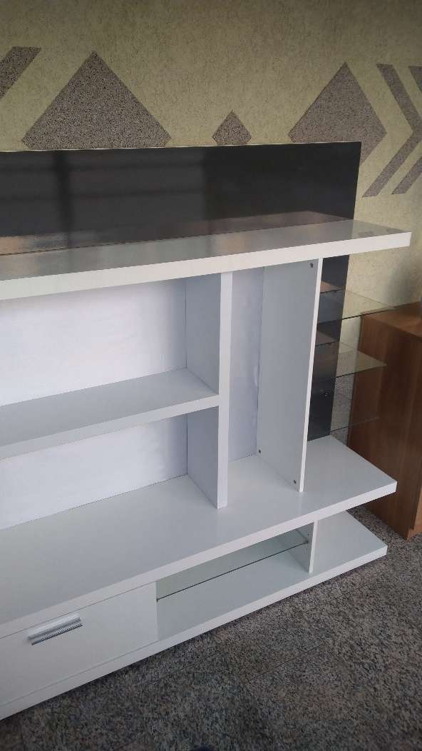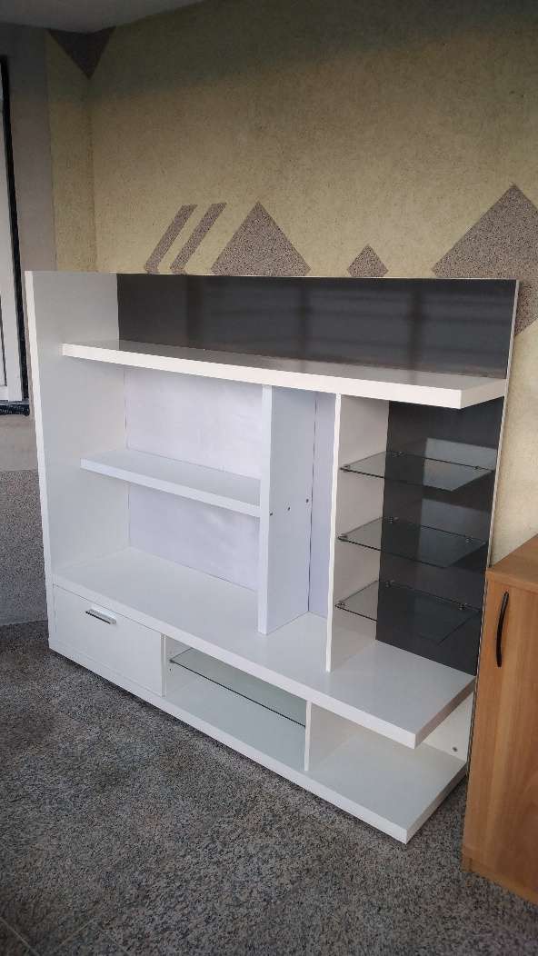 Raumteiler mit Glasablagen und Schublade