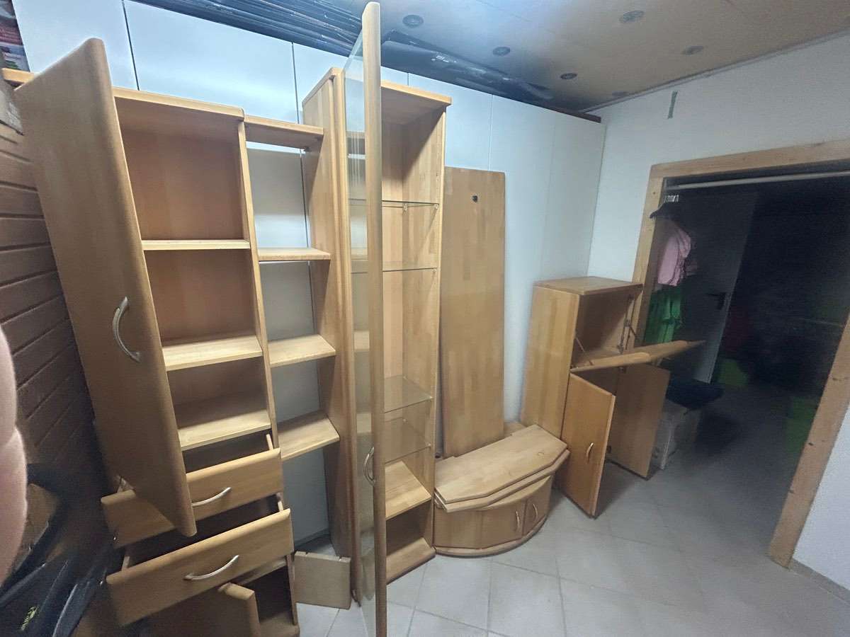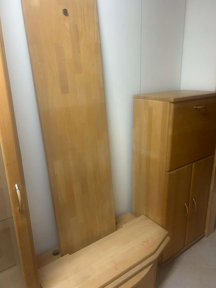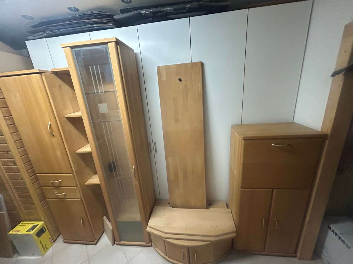 Vollholz Wohnzimmerverbau Tischlerware Buche massiv gewachst zu verschenken Um baldige Abholung nach Terminvereinbarung wird gebeten!!! Maße siehe in den Fotos, Gesamtbreite 264 cm höchster Schrank 215 cm, Tiefe der Schränke 36 cm, TV Bank 57 cm tief...