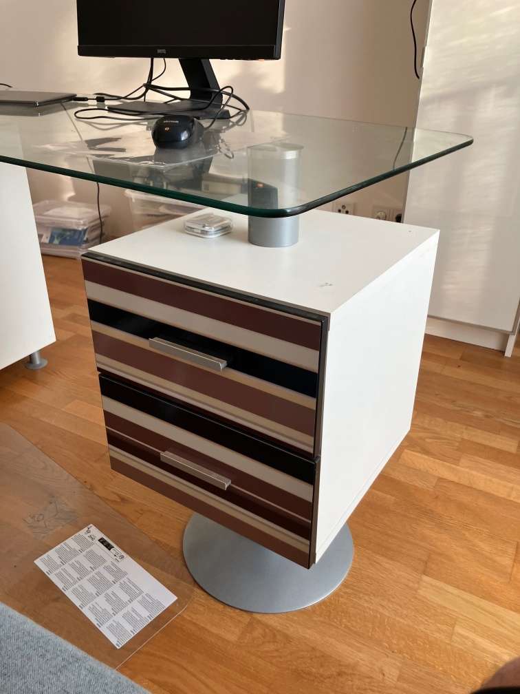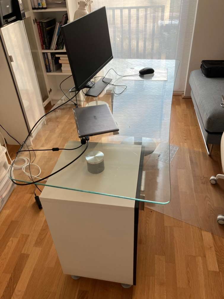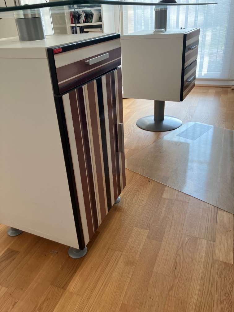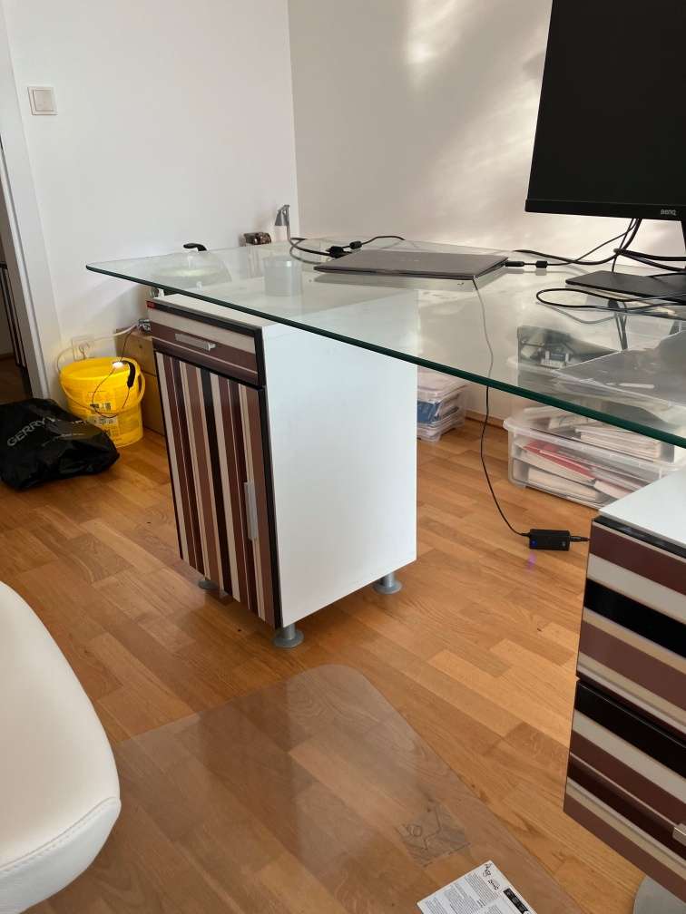 Schreibtisch Korpus weiß Dekor - Gestell Metall - Platte Sicherheitsglas - 3 Laden und 1 Tür B 150 cm H 75 cm T 72 cm Erstbesitz Nichtraucherhaushalt Ich helfe gerne beim Abbau und bei Fragen einfach melden!