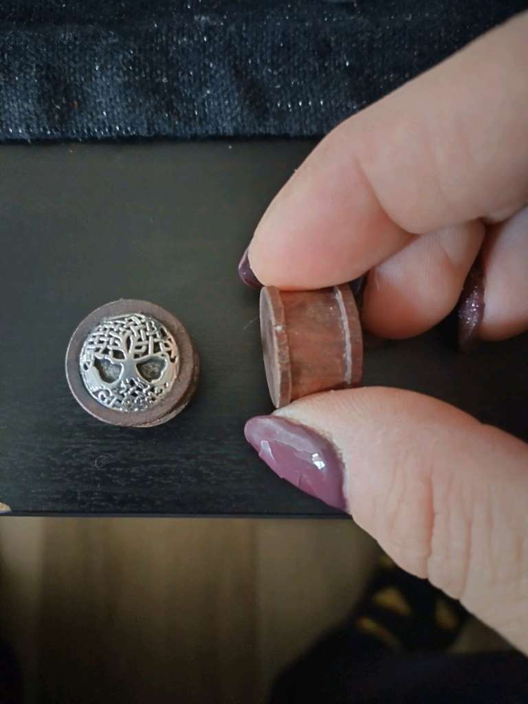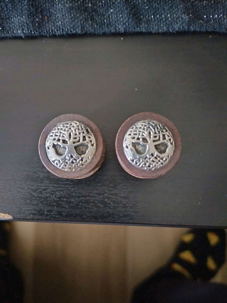 Holzplugs Paar 16 mm mit silberfarbenen Weltenbaum Einmal getragen Einer der Plugs hat einen kleinen Fehler wie man am Foto sehen kann