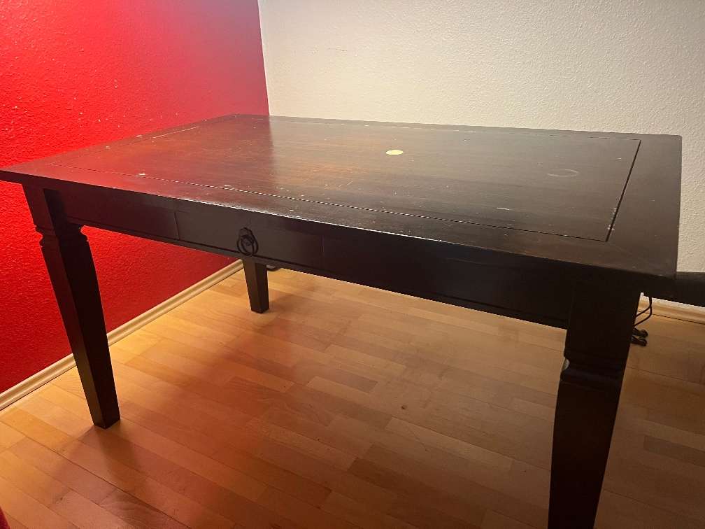 Deutliche Gebrauchsspuren, wie auf den Fotos sichtbar. Tisch: Breite: 85,5cm Länge: 145cm Höhe: 78,3 cm