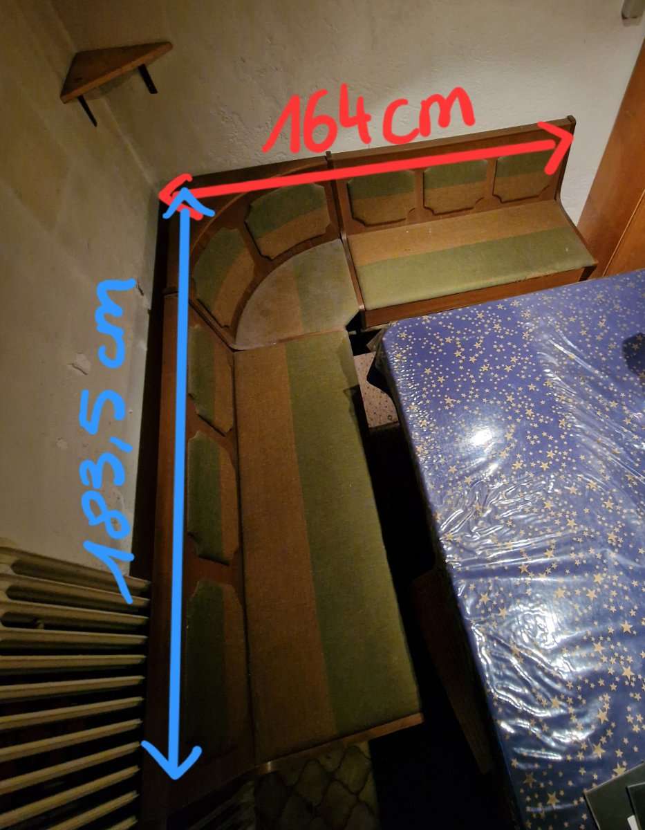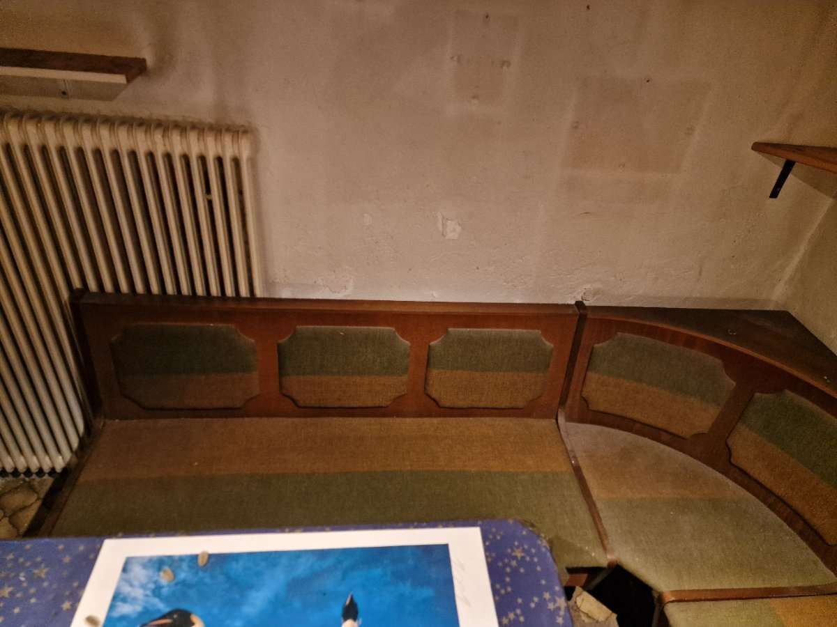Verschenke eine massive Holz-Eckbank mit gemütlicher Polsterung in Grün/Braun. Das Beste: Beide Sitzflächen lassen sich aufklappen und bieten sehr viel Stauraum (Truheneckbank). Privatverkauf, daher keine Gewährleistung oder Garantie.