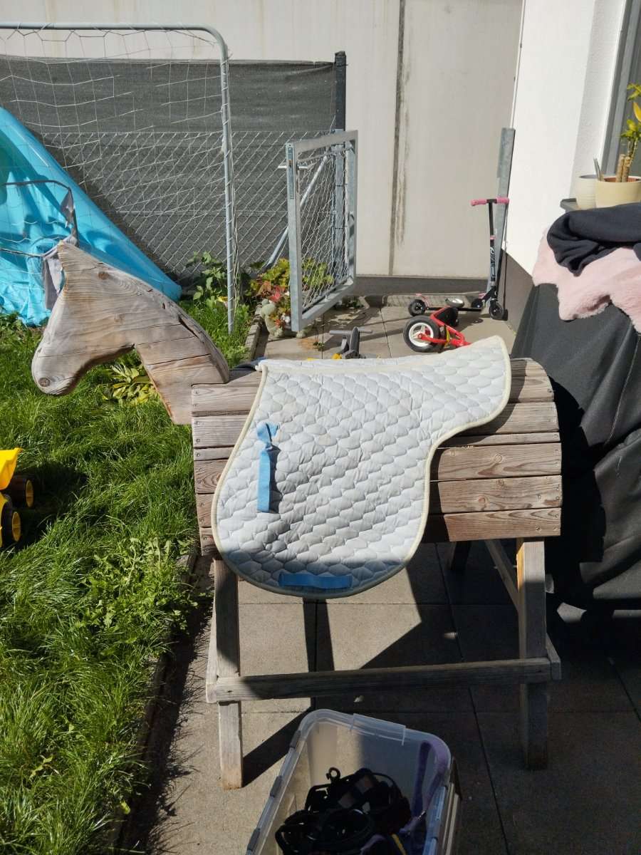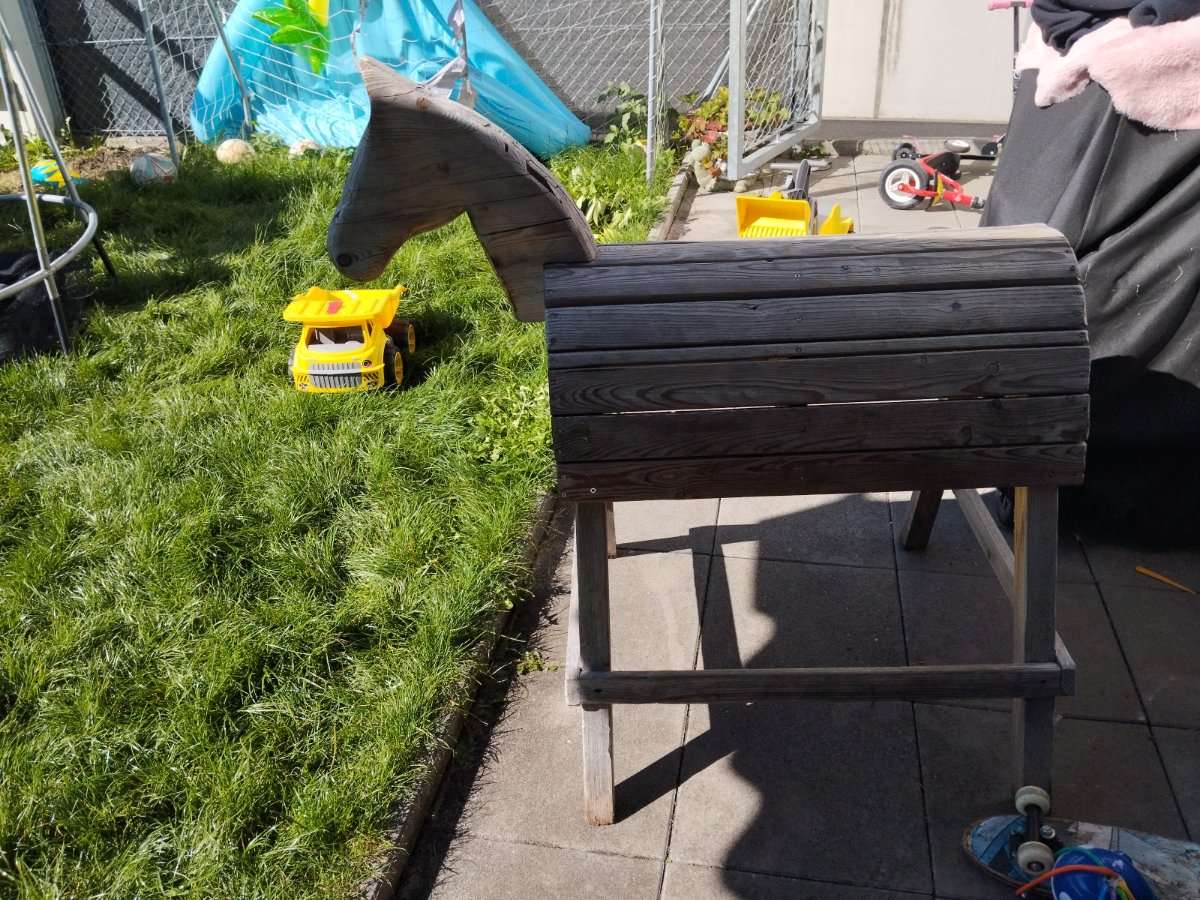Gebrauchtes Holzpferd vom Tischler zu verkaufen dabei ist eine Kiste mit Reitzubehör (Decke, Halfter Stricke usw)