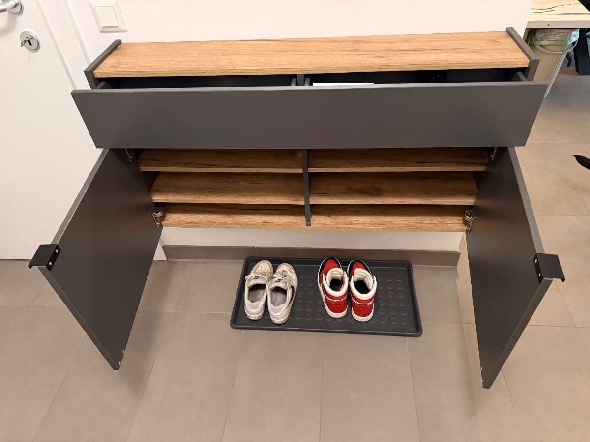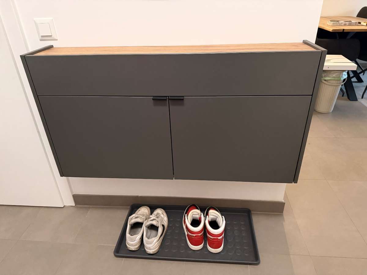 Hallo, ich verschenke diese Kommode aufgrund eines Umzugs. Dieses Möbelstück wurde im Jahre 2024 neu gekauft. Kaufpreis war: 250€ Fakten: Farbe: graphit (korpus) und Eiche (Deckplatte) Größe: 22T/ 57H/ 110B cm hängend oberer Bereich Schublade unten 2...