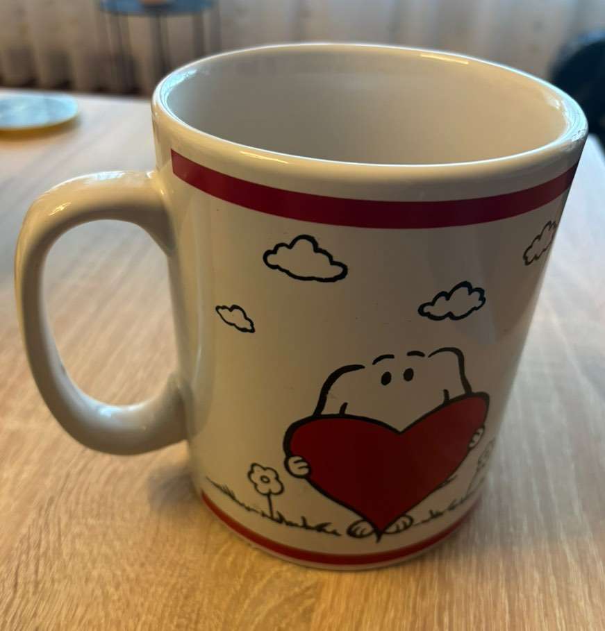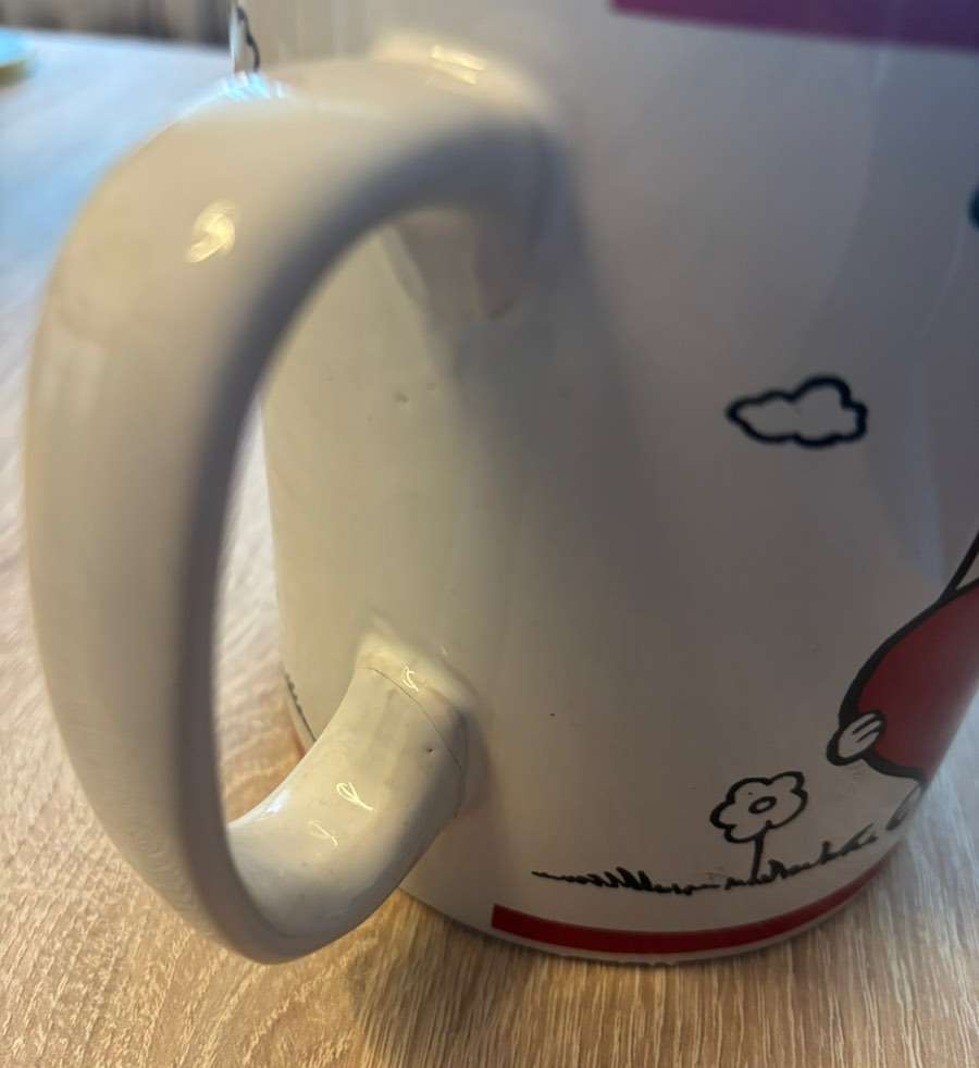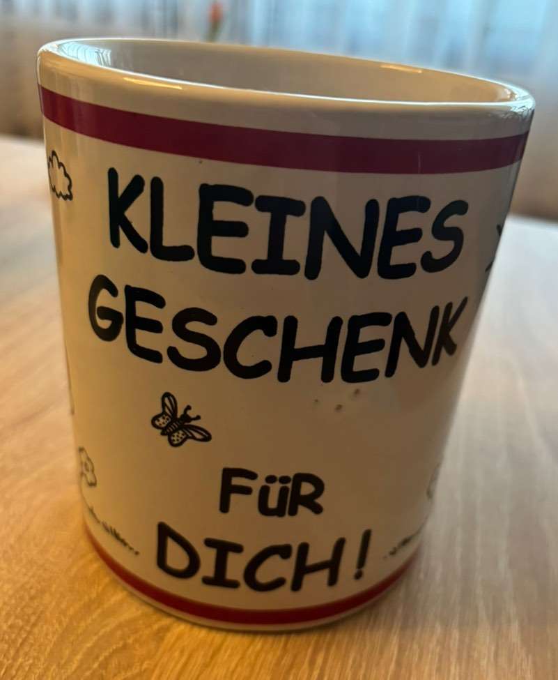 Verschenke große Tasse aus der nie getrunken wurde. War nur als Dekoobjekt in Verwendung. Es ist möglich, sie im leeren Zustand beim Henkel zu nehmen, jedoch ist beim Henkel (wie am Foto ersichtlich) ein kleiner Riss erkennbar. Tasse aber als Geschenk...