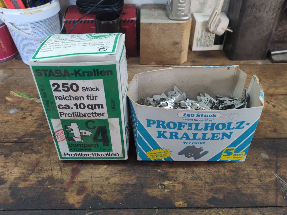 Scheunenfund. 2 Schachtel mit Profilholzkrallen bzw. Profilbrettkrallen.