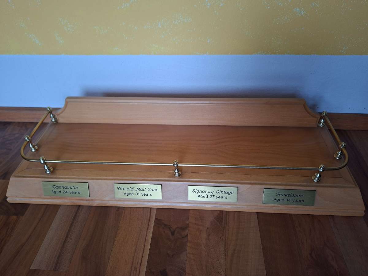 Aufsteller aus Massivholz mit Messinggestell für 4 Flaschen Whisky oder ähnliches. Nur Abholung!