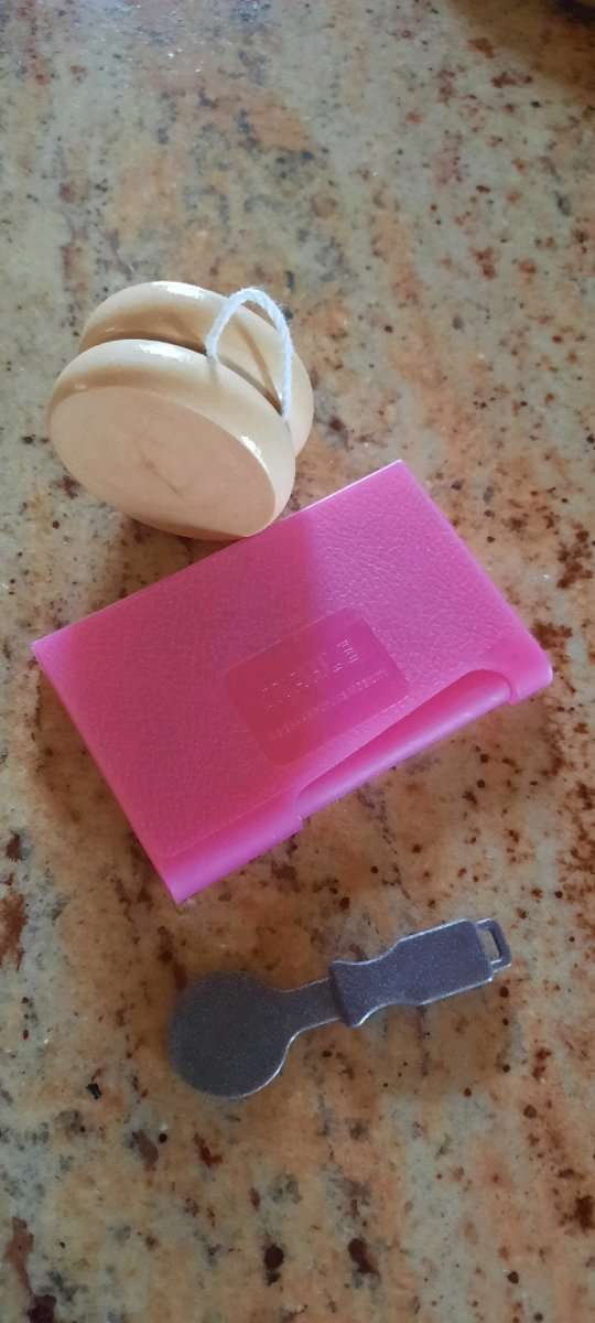 Yoyo aus Holz, eine Einkaufswagenmünze als Schlüsselanhänger und ein Geldscheinetui für die Hosentasche zum Einstecken in Scheckkartenformat