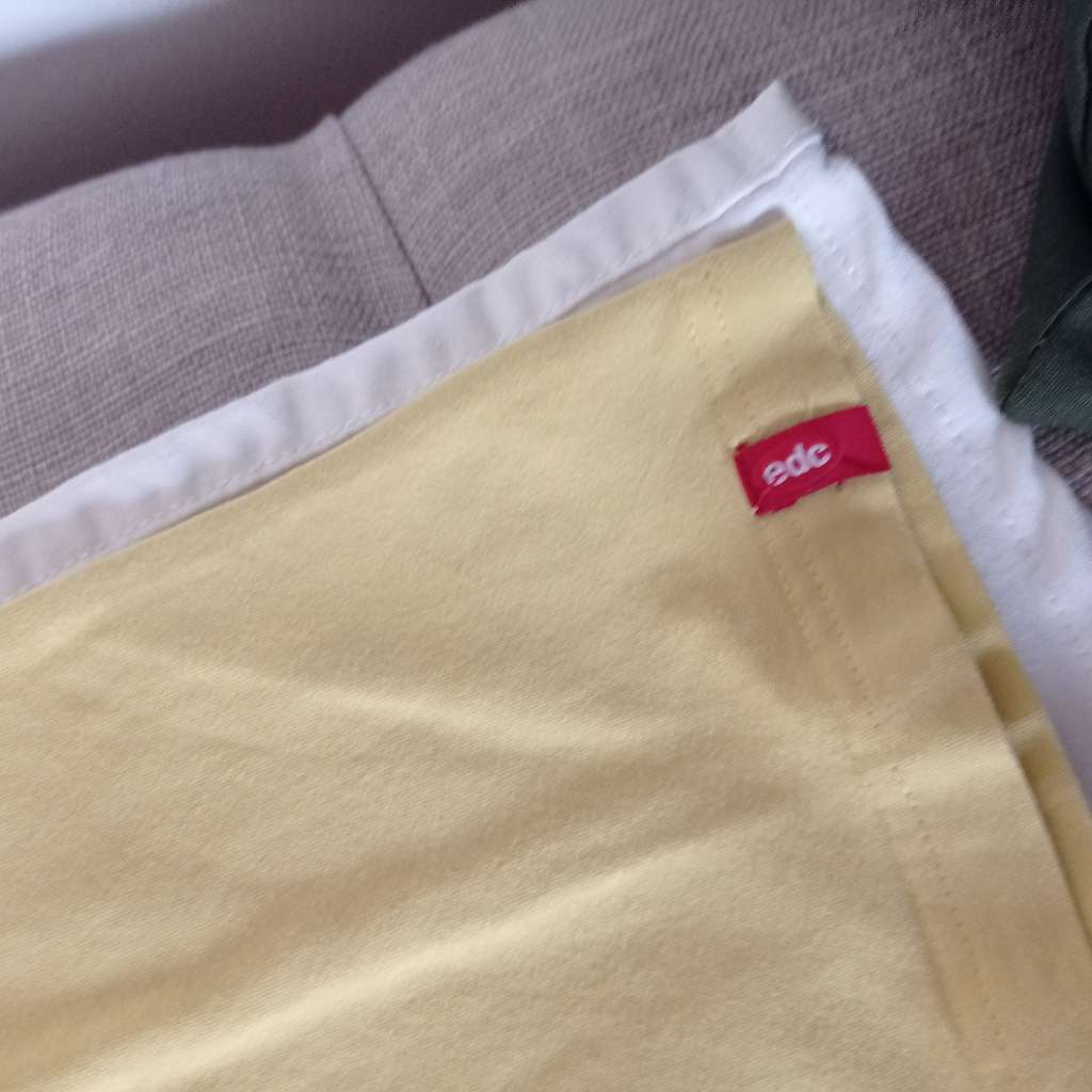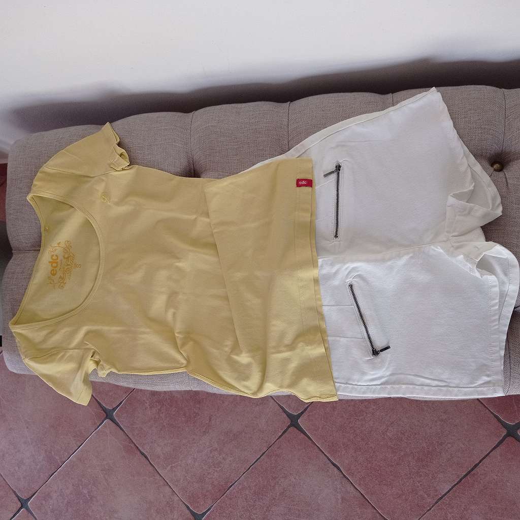 Schönes zwei teiliges Set: Kurze Hose sehr hübsch mit dem Reißverschluss hinten!! und vorne li und re, höher geschnitten, schöne Passform, von der Größe her, wie Gr 36 Gelbes T-Shirt v edc Gr S Privatverkauf ohne Garantie Keine Haustiere und...