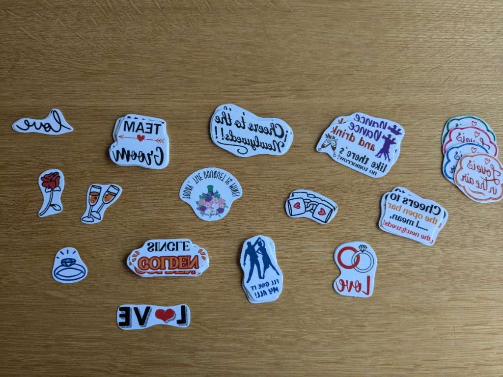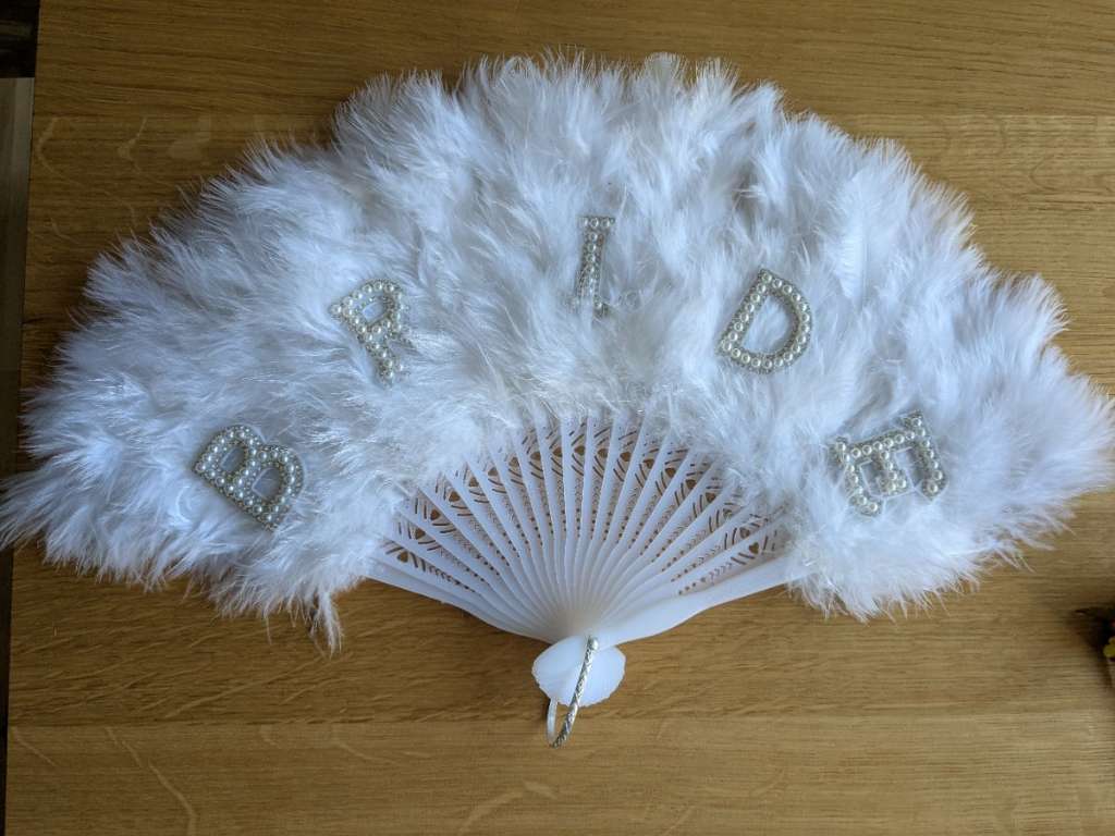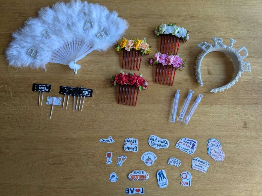 Ich verschenke die Sachen von meiner Bachelorette Party! Die sind: 1x Fächer Bride 1x Haarreifen Bride 4x Haarschmuck mit Blumen Verschiedene Tattoos Einige Mrs-Mr-Fänchen 3x Seifenblasen