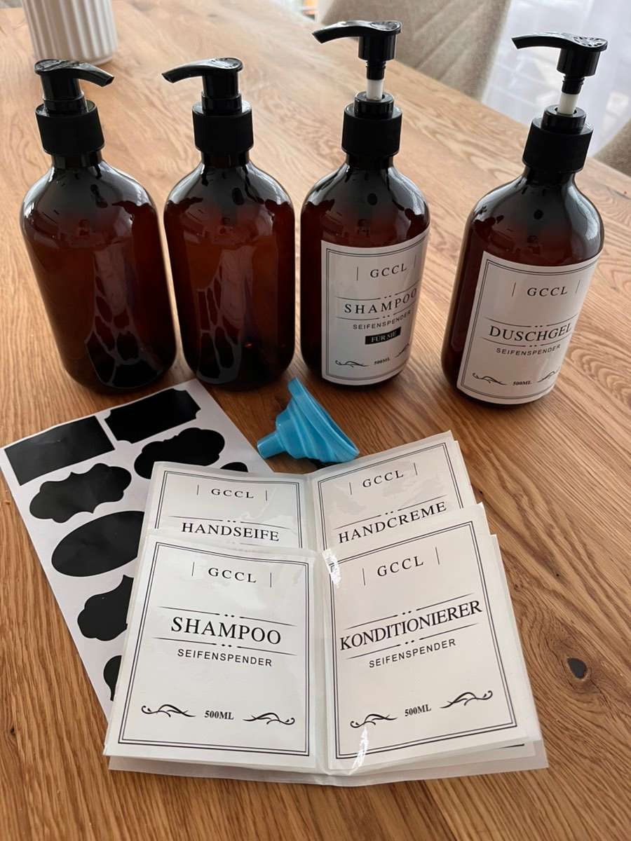 Verschenke 4 Spender zum Befüllen für Seife, Duschgel, Lotion usw. mit selbstklebende Etiketten. 2 Spender wurden benutzt und riechen etwas nach dem Duschgel, 2 sind neu.