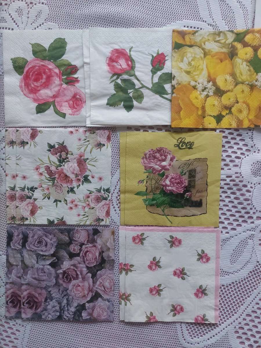 Jeweils 2 Stück Servietten aus 6 Packungen mit dem Thema Rosen Also 12 Servietten je 2x 6 Motive außer 1x gelbe Rosen, dafür links oben 3x Würde mich freuen, wenn jemand mit mir Tauschen möchte... Habe noch viele weitere Motive für andere Jahreszeiten......
