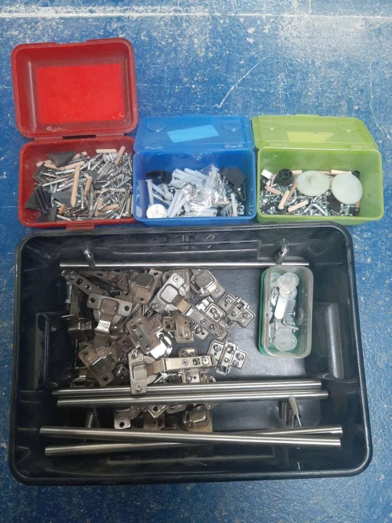 Verschenke hier laut Foto diverse möbel schrauben griffe Scharniere usw. Inkl. Der Boxen aber ohne die schwarze Kiste Bei fragen einfach melden Versand möglich
