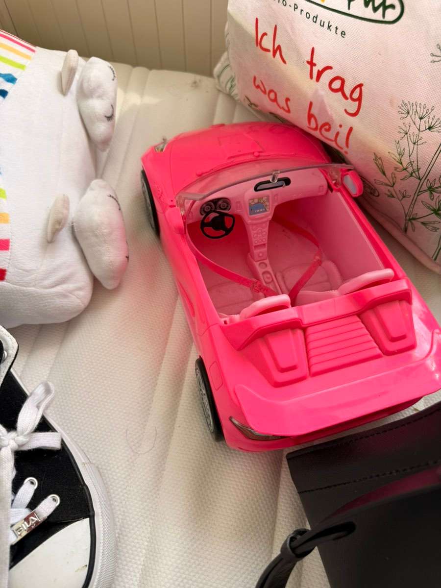 Barbie-Auto mit 3 Barbiepuppen und Kleidung.