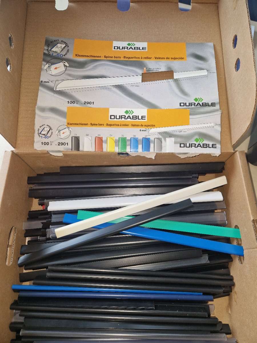 Durable Klemmschienen zur Bindung von Dokumenten. Verwendung: Zum schnellen Binden von Dokumenten ohne Lochen. Kapazität: Geeignet für bis zu 60 Blatt (80 g/m²) pro Schiene. Größe: Ausgelegt für das Format DIN A4.