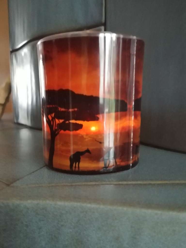 Ein Glas mit stimmungsvollem Sonnenuntergang mit afrikanischer Siluette.