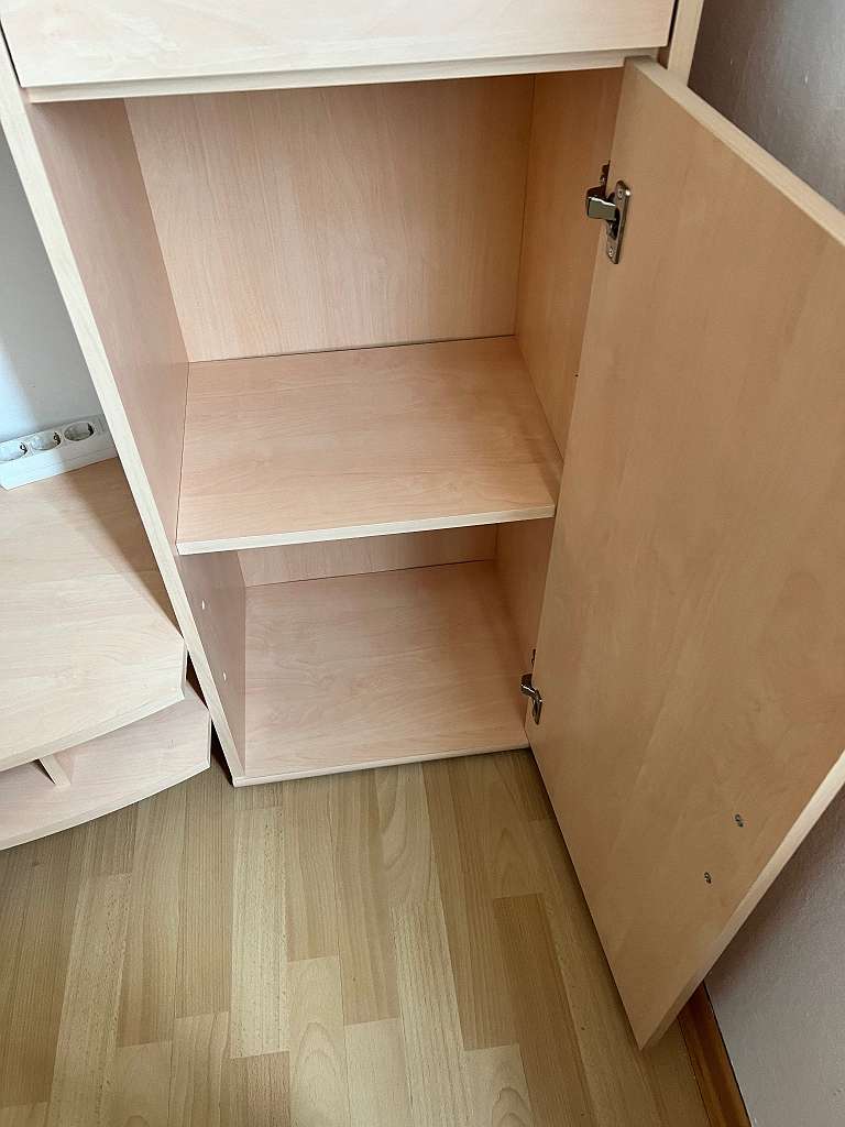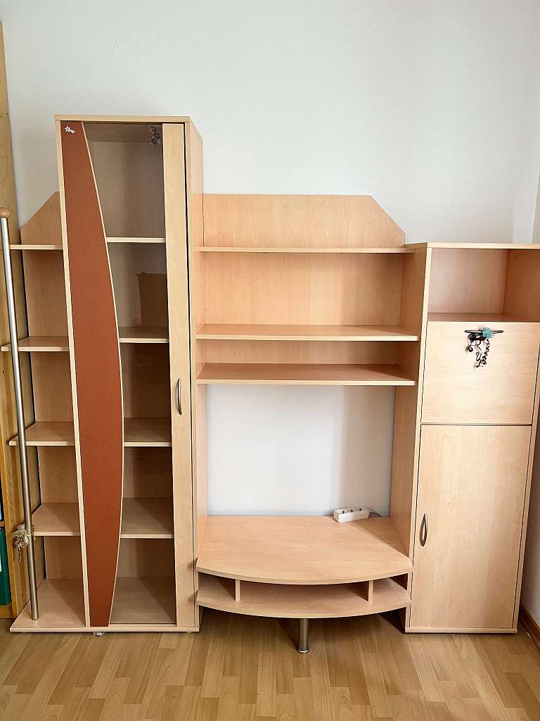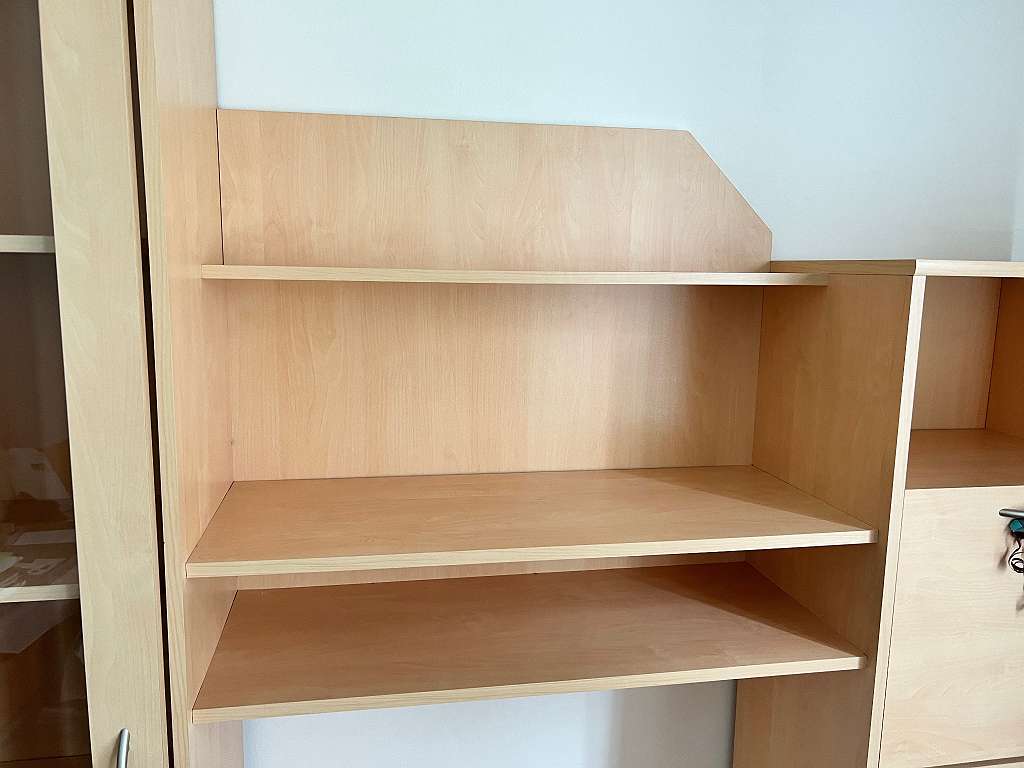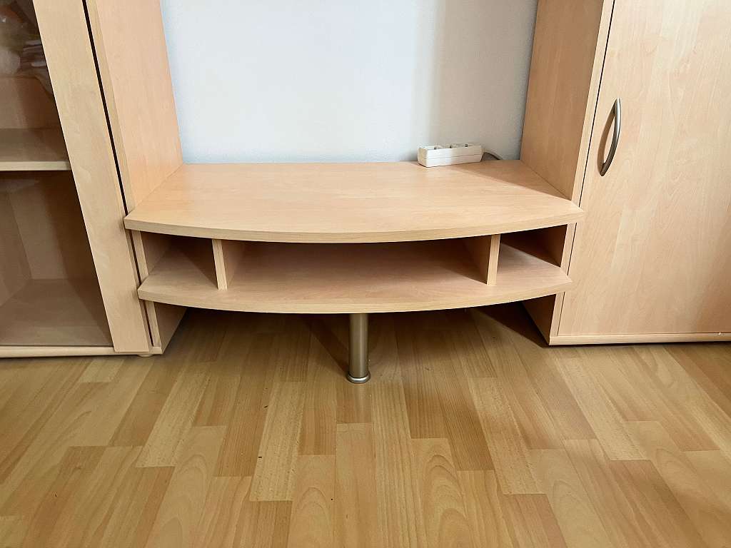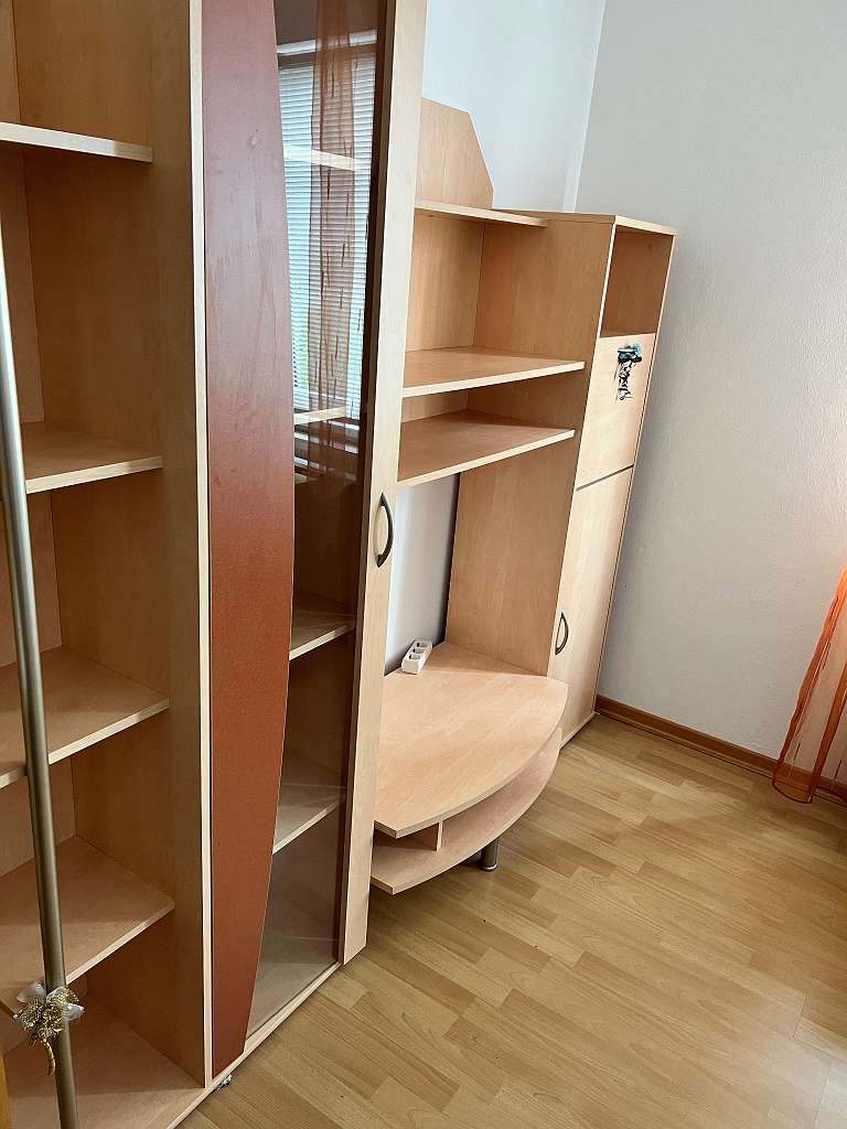 Wohnwand in Buche abzugeben, mit Vitrine, Bücherregal, Bar/ Kommode. Alle Scharniere funktionieren. Prima Zustand! Wird aufgrund von Umgestaltung abgegeben. Lediglich eine kleine Kerbe beim Bücherregal, welche minimal ist, ebenso am Foto ersichtlich....