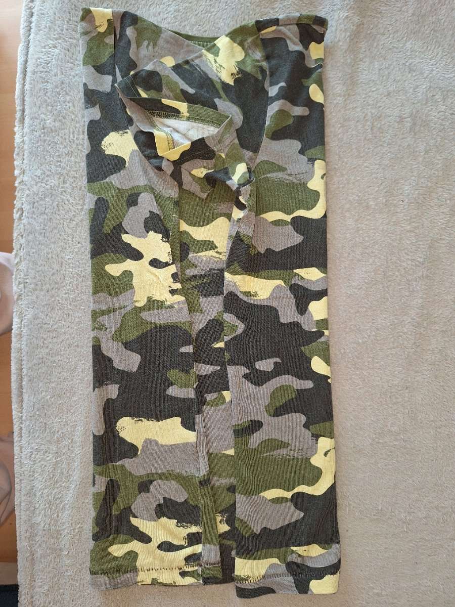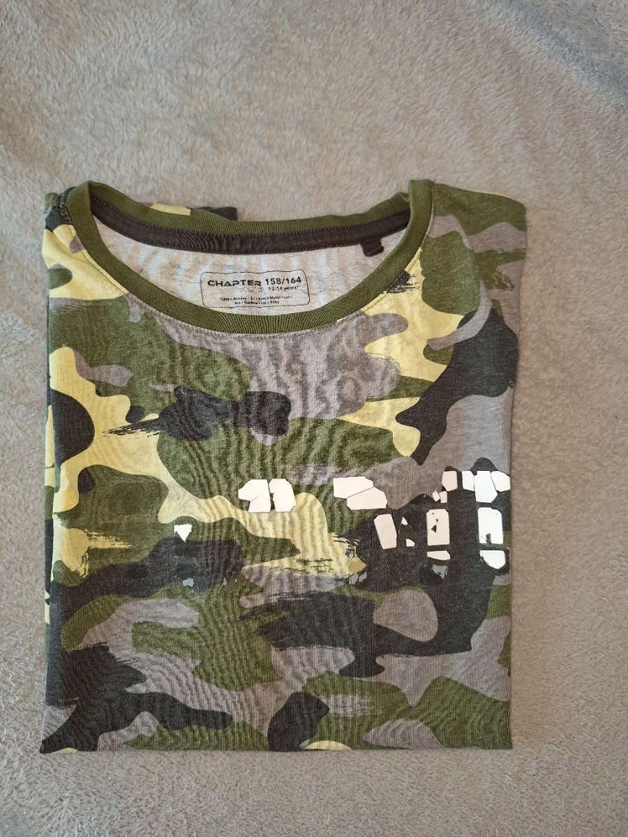 Verschenken von Chapter Young beim Takko ein kurzes T-Shirt für Jungs in der Gr. 158/164; Farbe: camouflage grün; normale Gebrauchspüren- keine Flecken, keine Löcher; Einwandfrei. Es befand sich an der vordere Seite des T-Shirt ein Schrifft. Mein Sohn...