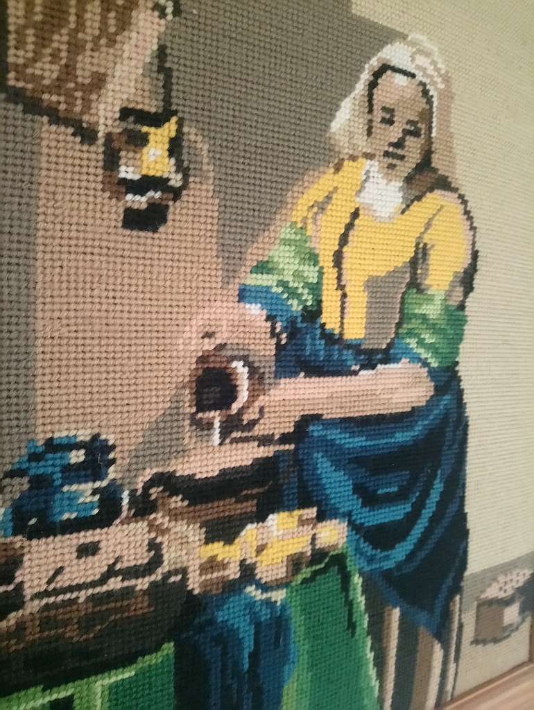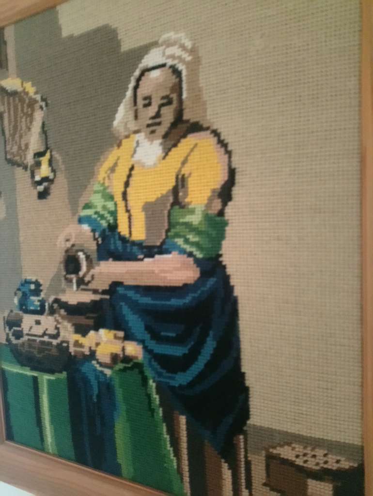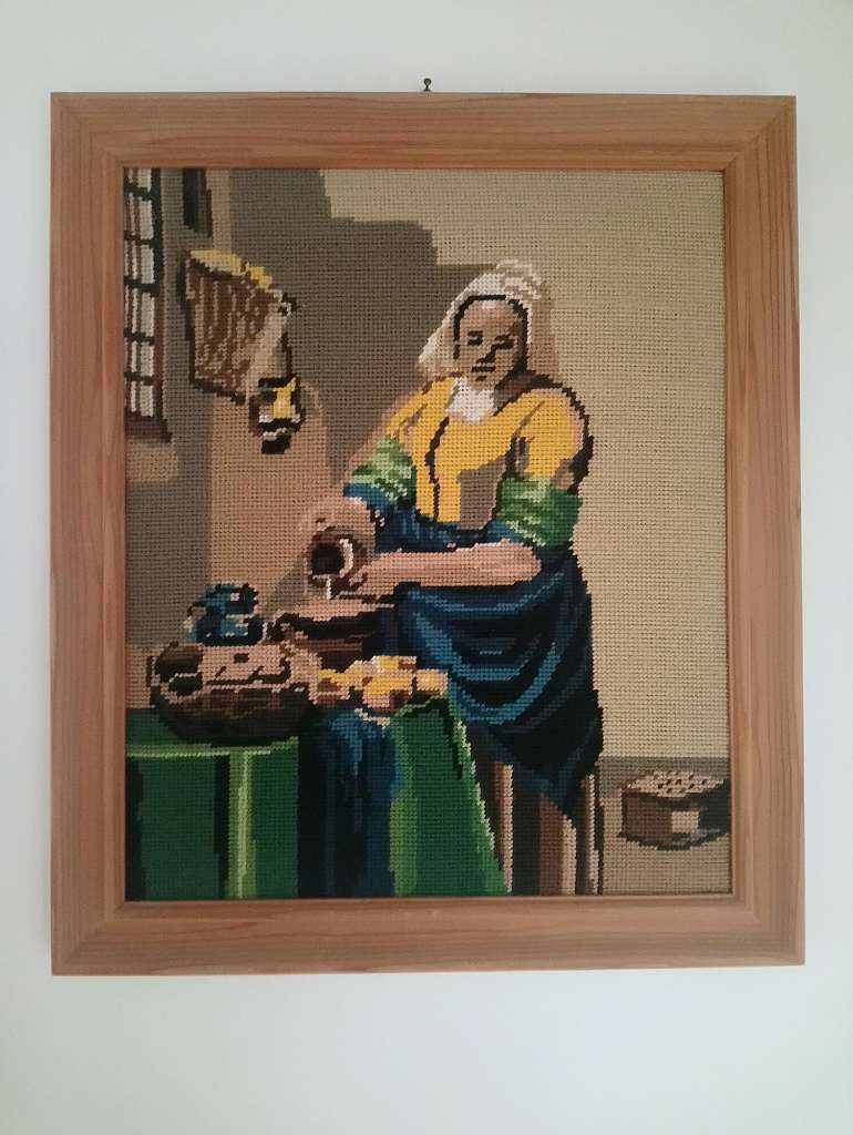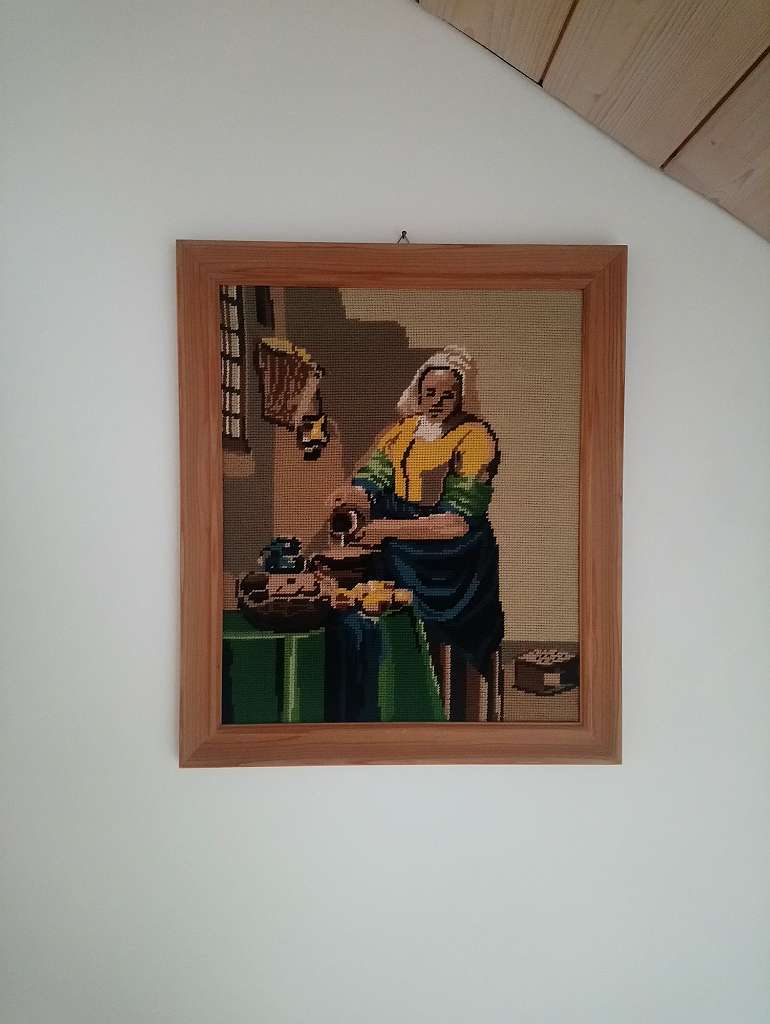Handgesticktes Bild, Erbstück Rustikales Motiv, Hausarbeit, Kochen, gerahmt mit Holzrahmen Größe: 47 x 40 cm (41,5 x 35 cm ohne Rahmen)