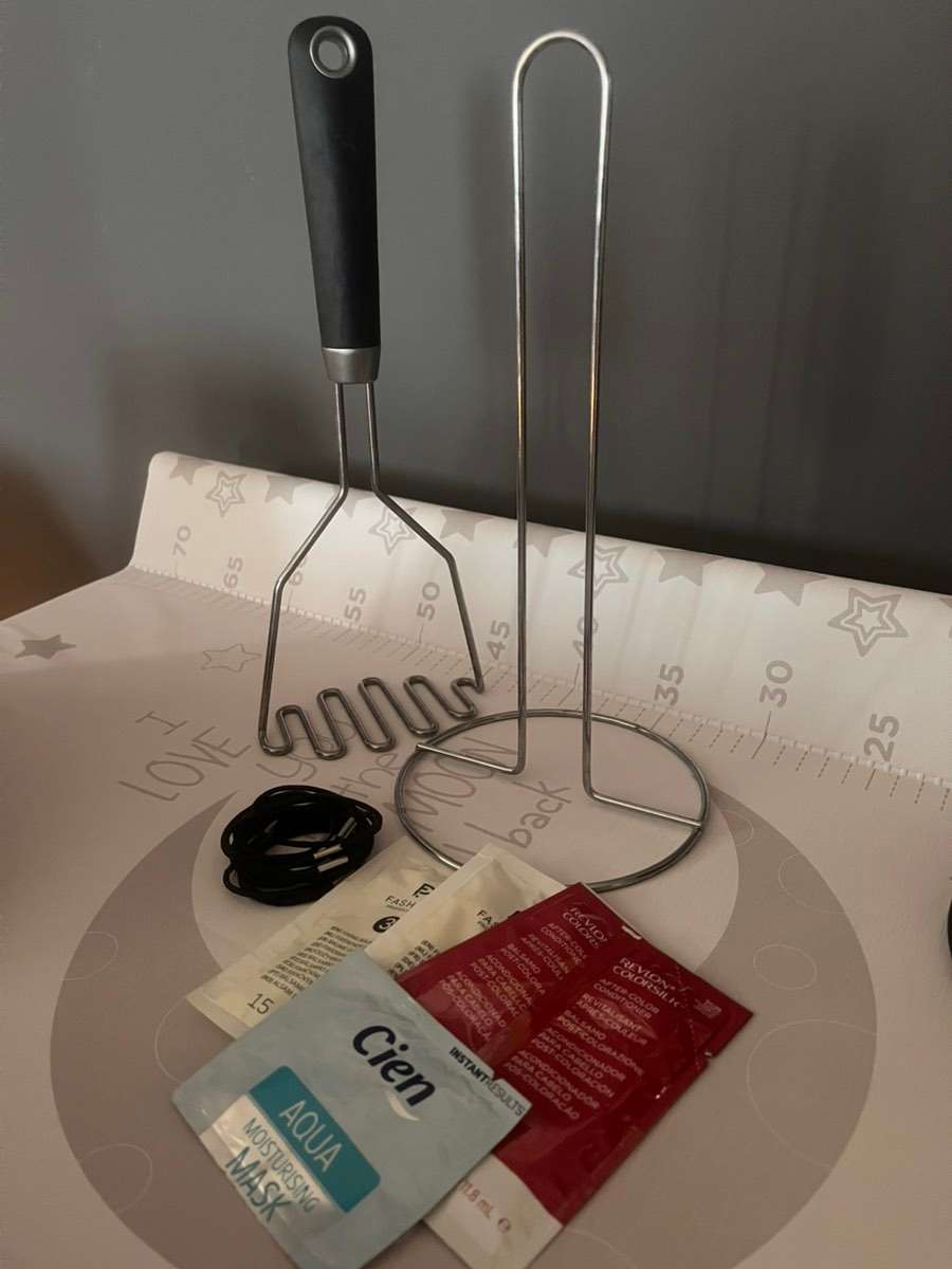 Kartoffelstampfer, Küchenrollenhalter, Gesichts- und Haarmasken, unbenutzte Haargummis. Für eine 1,5-Liter Zero Pepsi.
